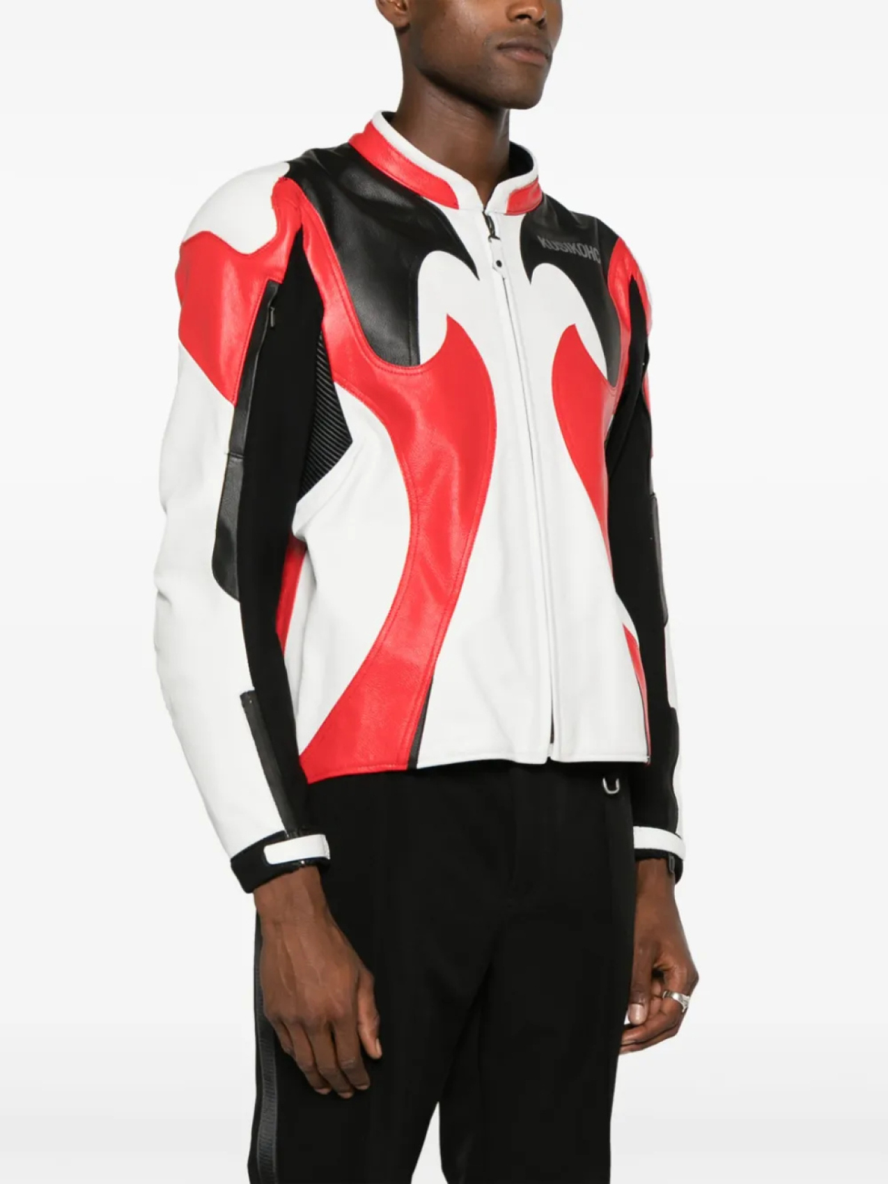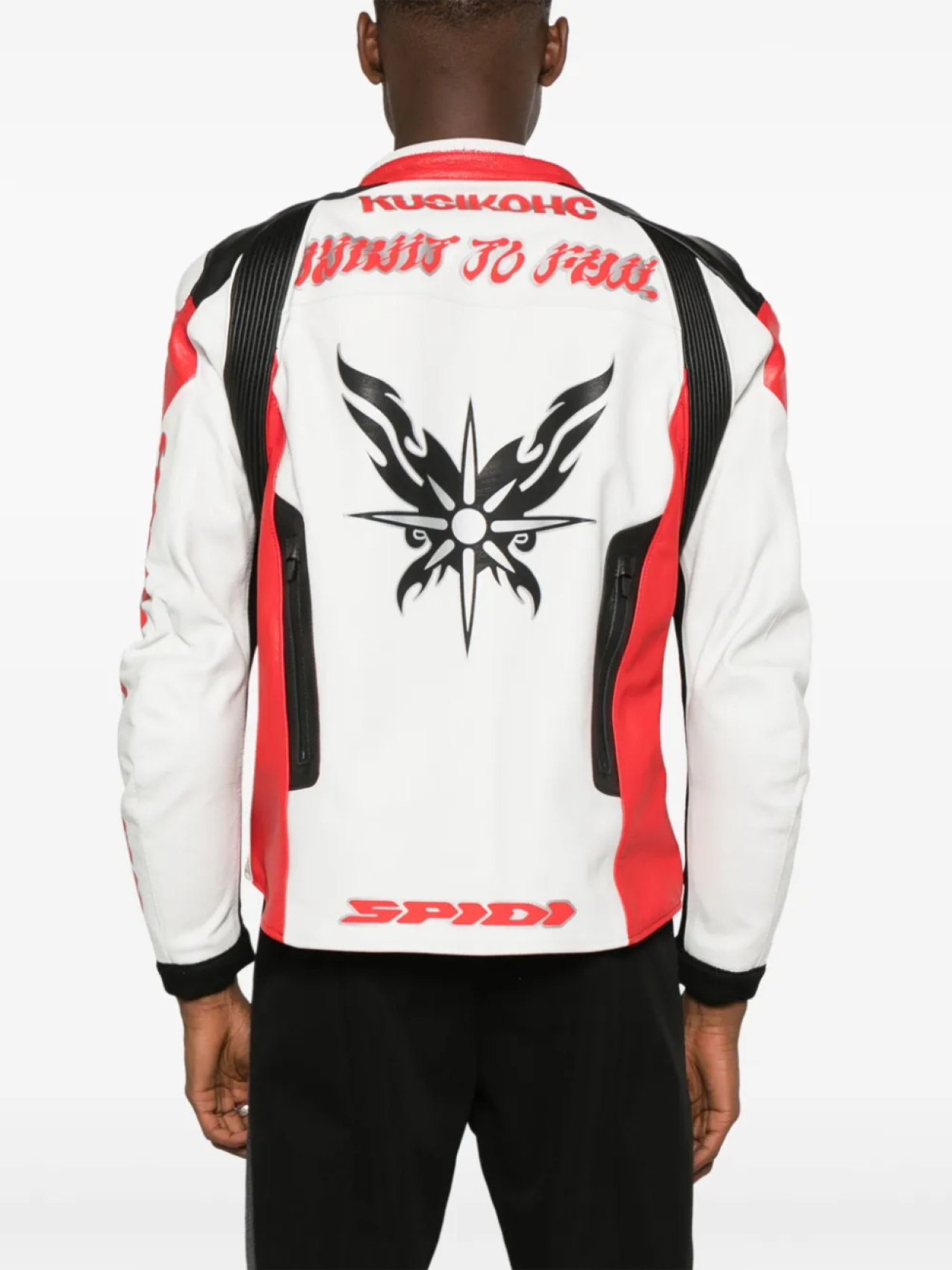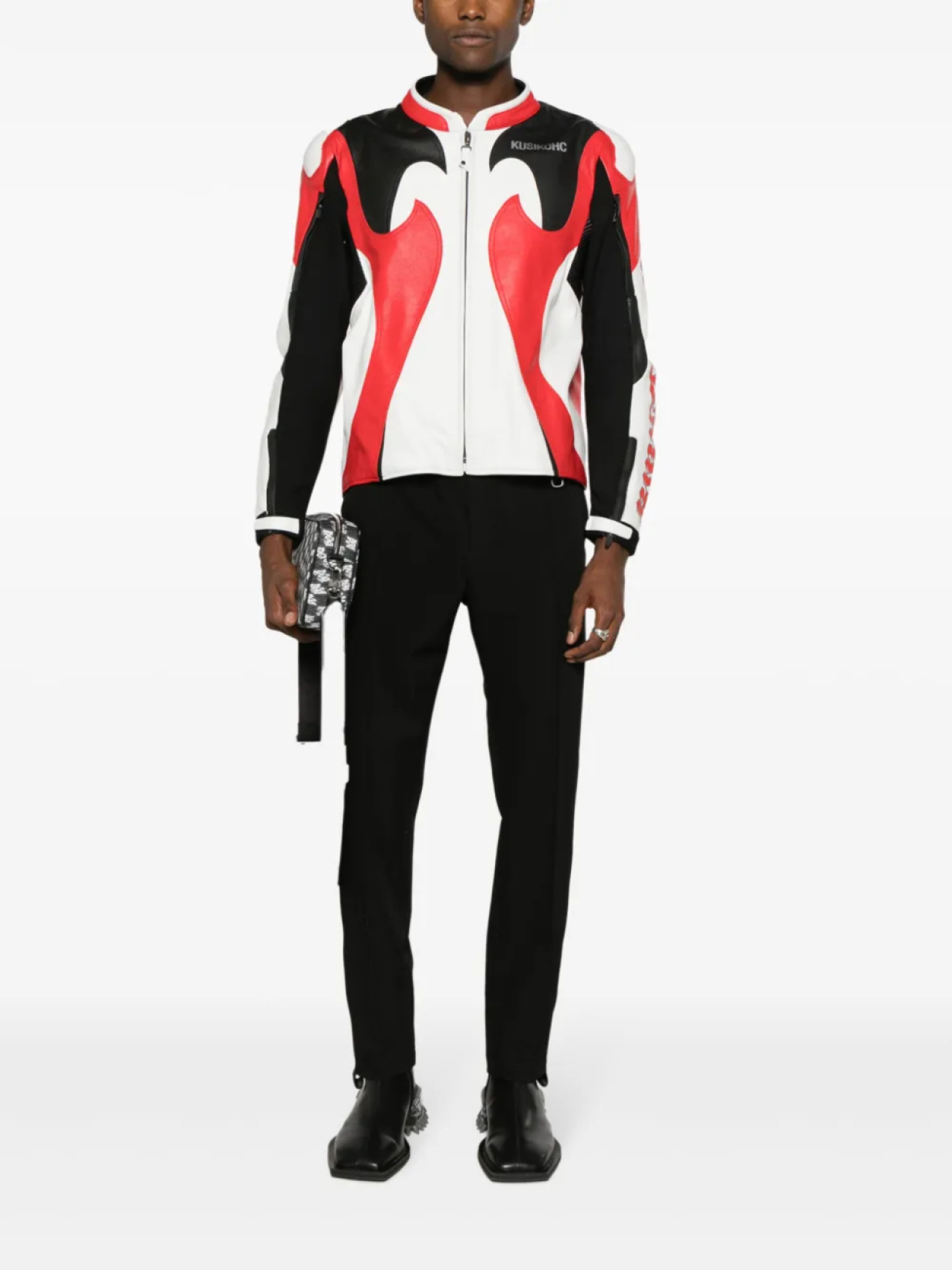 Светло-красный, белый, черный, телячья кожа, вставки, графичный принт на спине, принт с логотипом на груди, высокий воротник, застежка на молнии спереди и длинные рукава.