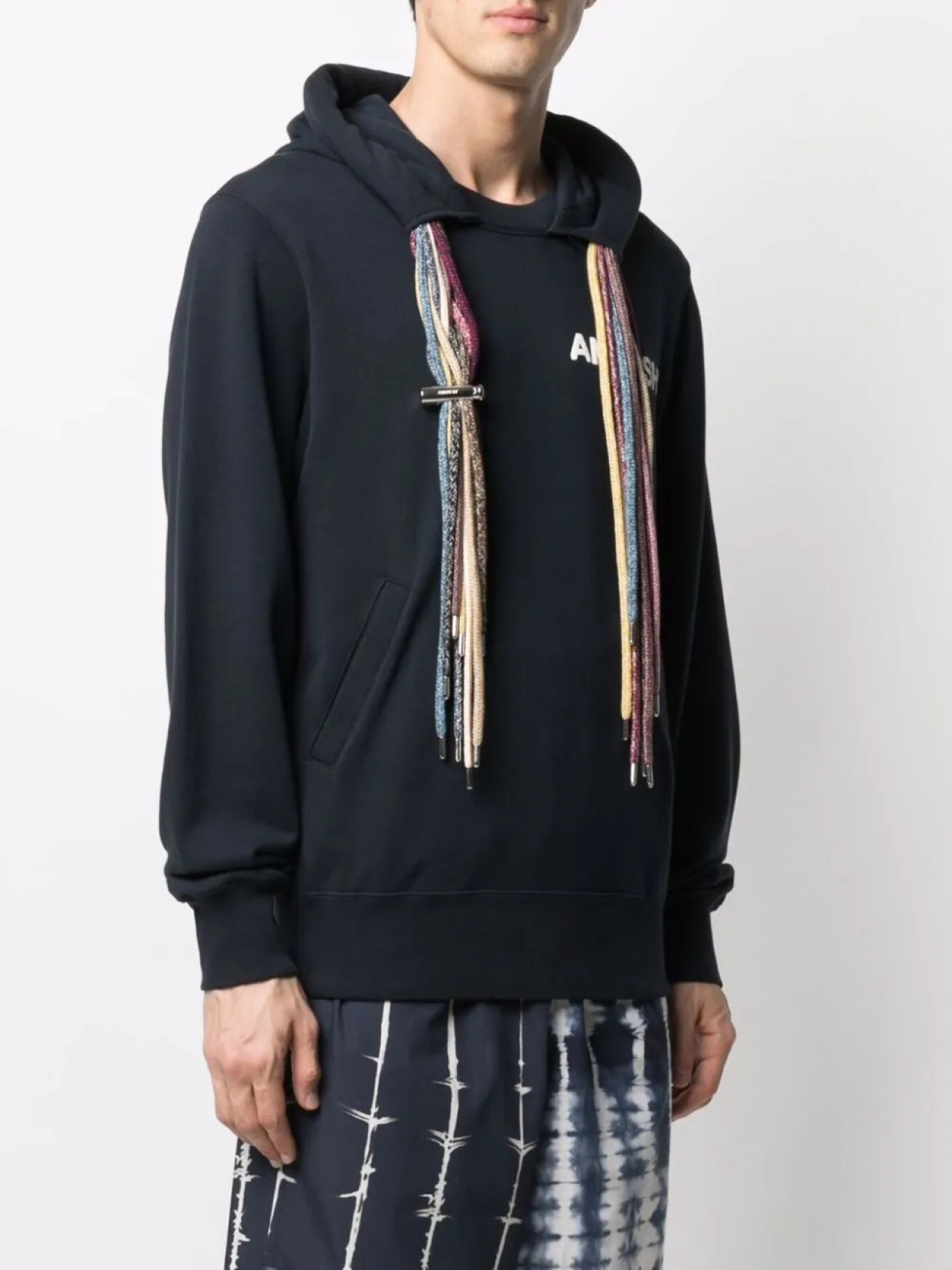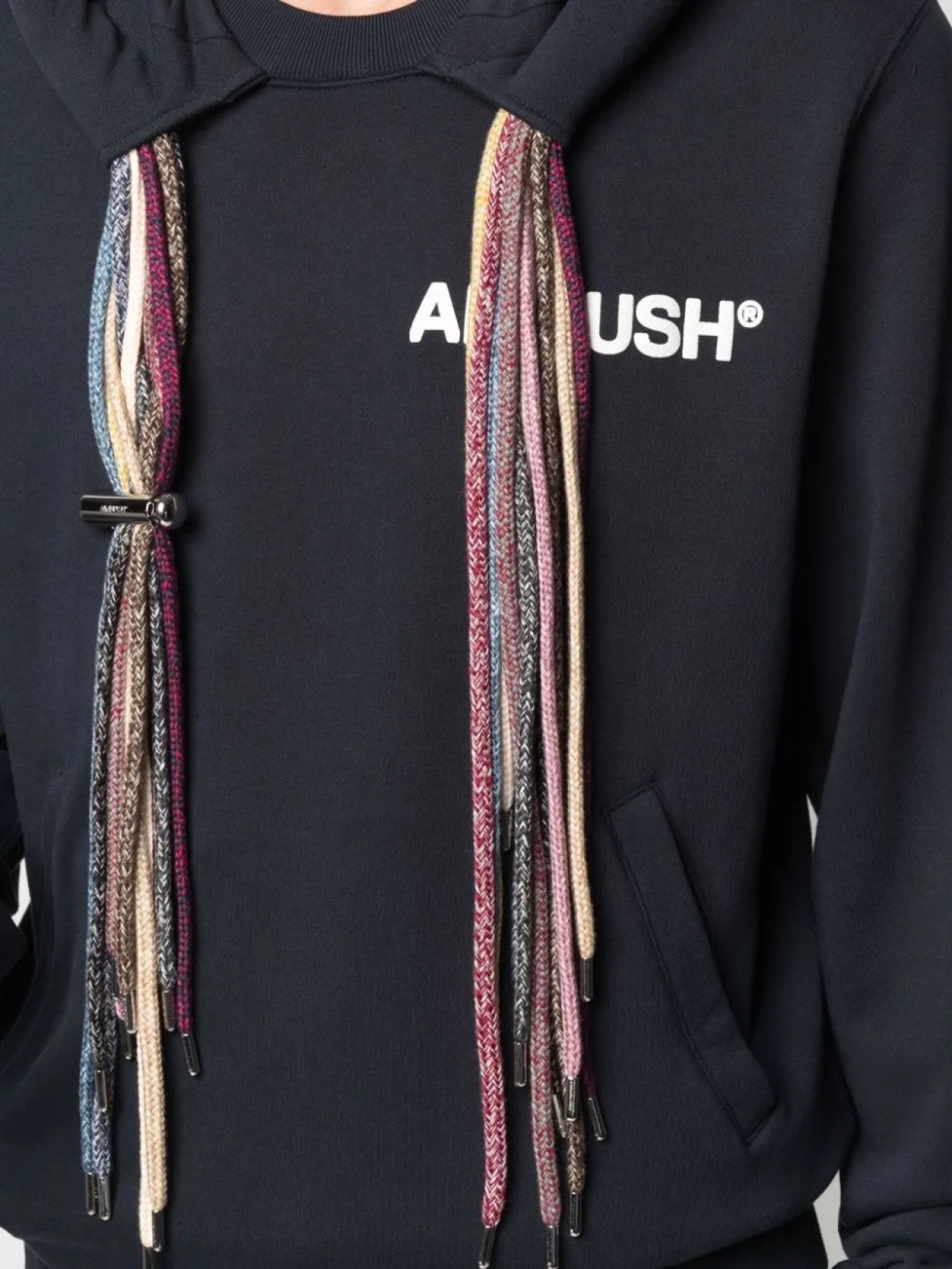 Толстовка со шнурками и логотипом от AMBUSH. Принт с логотипом спереди, застежка на шнурке, застежка на пуговицы "моржовый клык", приспущенные плечи, длинные рукава и боковые карманы.