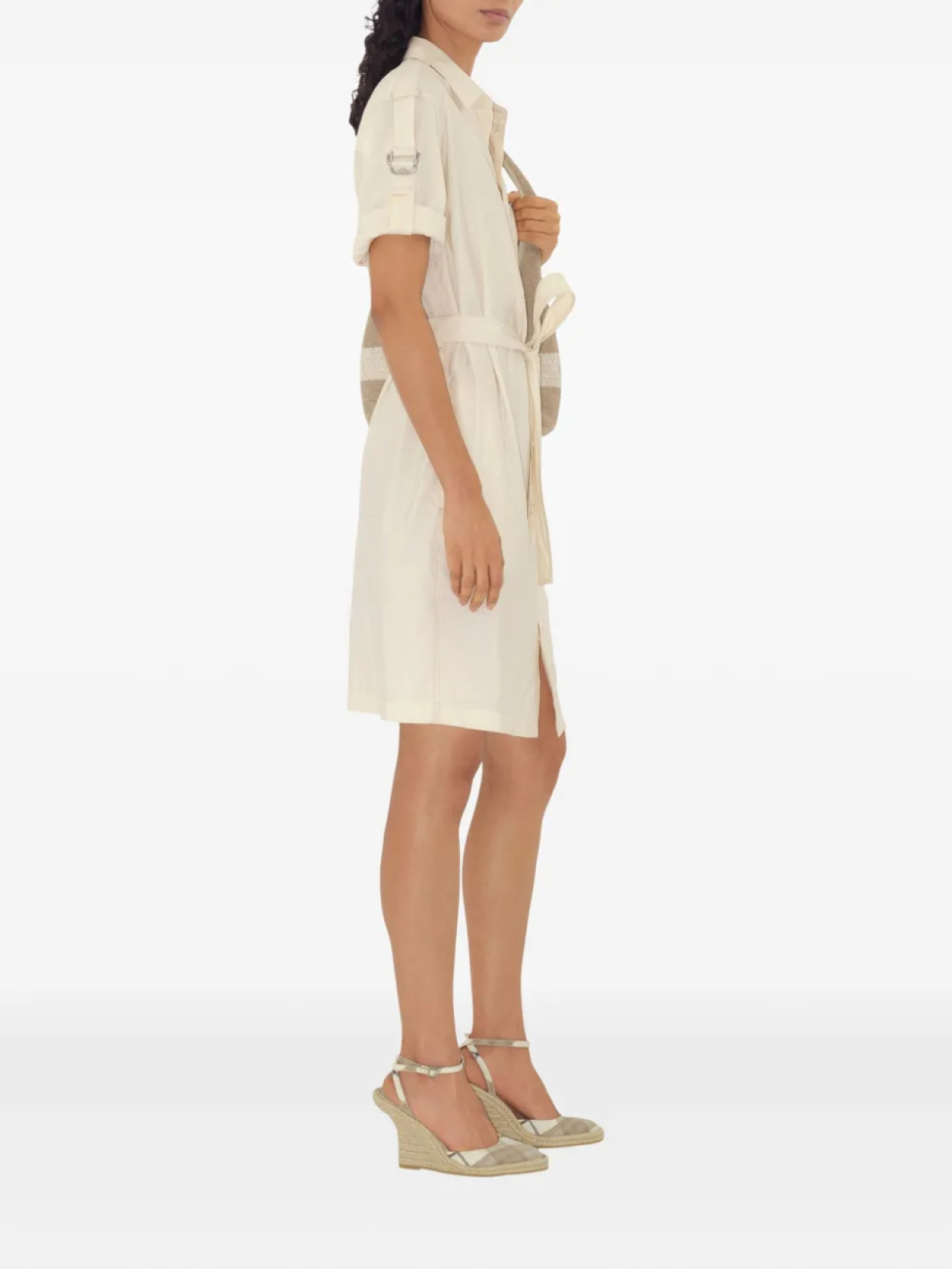 Белая застежка на пуговицы спереди, нагрудный накладной карман, пояс на талии, два прорезных кармана по бокам