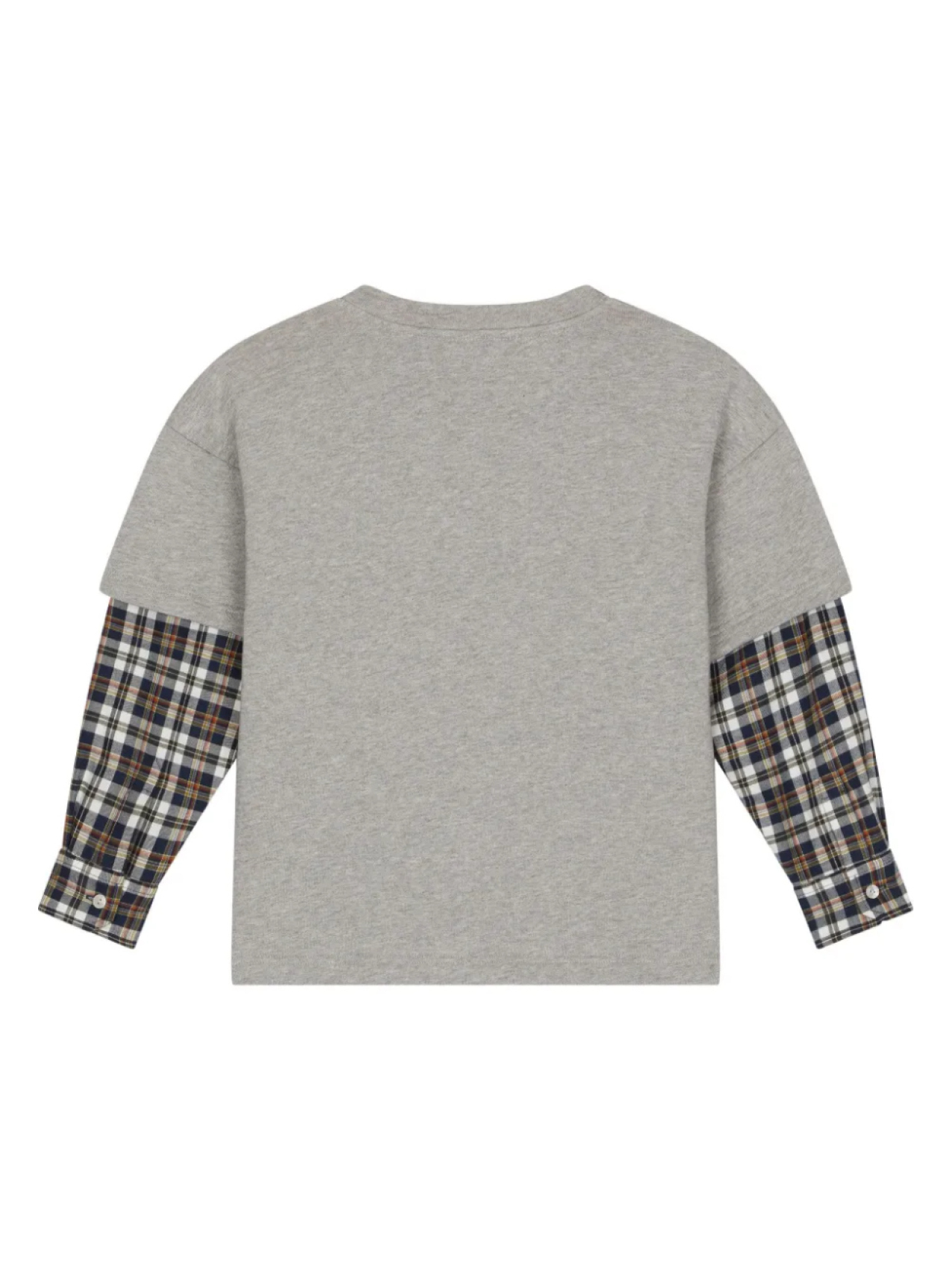 Светло-серый, разноцветный, смесовый хлопок, эффект меланж, клетчатый узор, логотип спереди, графичный принт спереди, круглый вырез, приспущенные плечи, двойные рукава, контрастные рукава, манжеты на пуговицах и прямой подол.