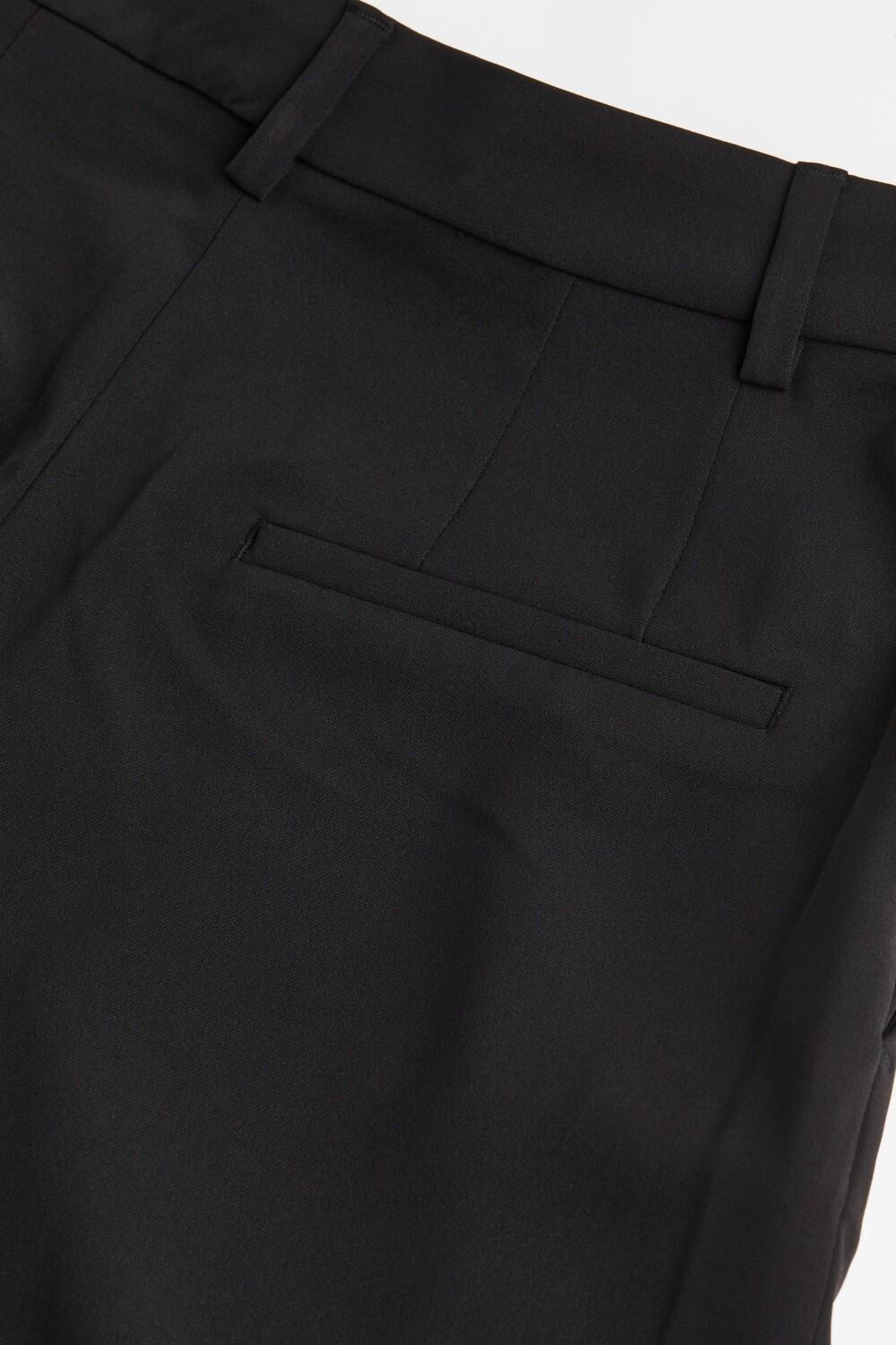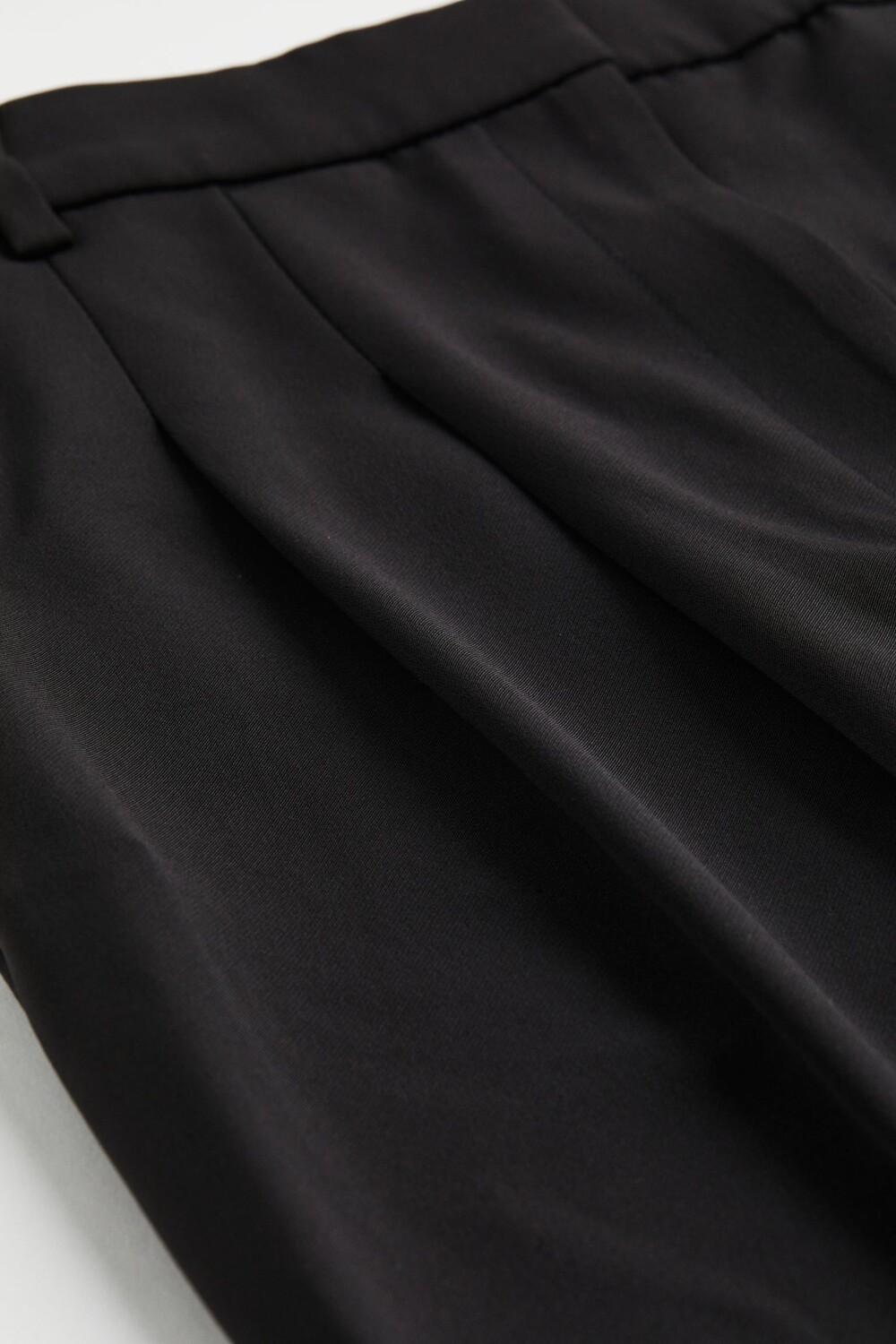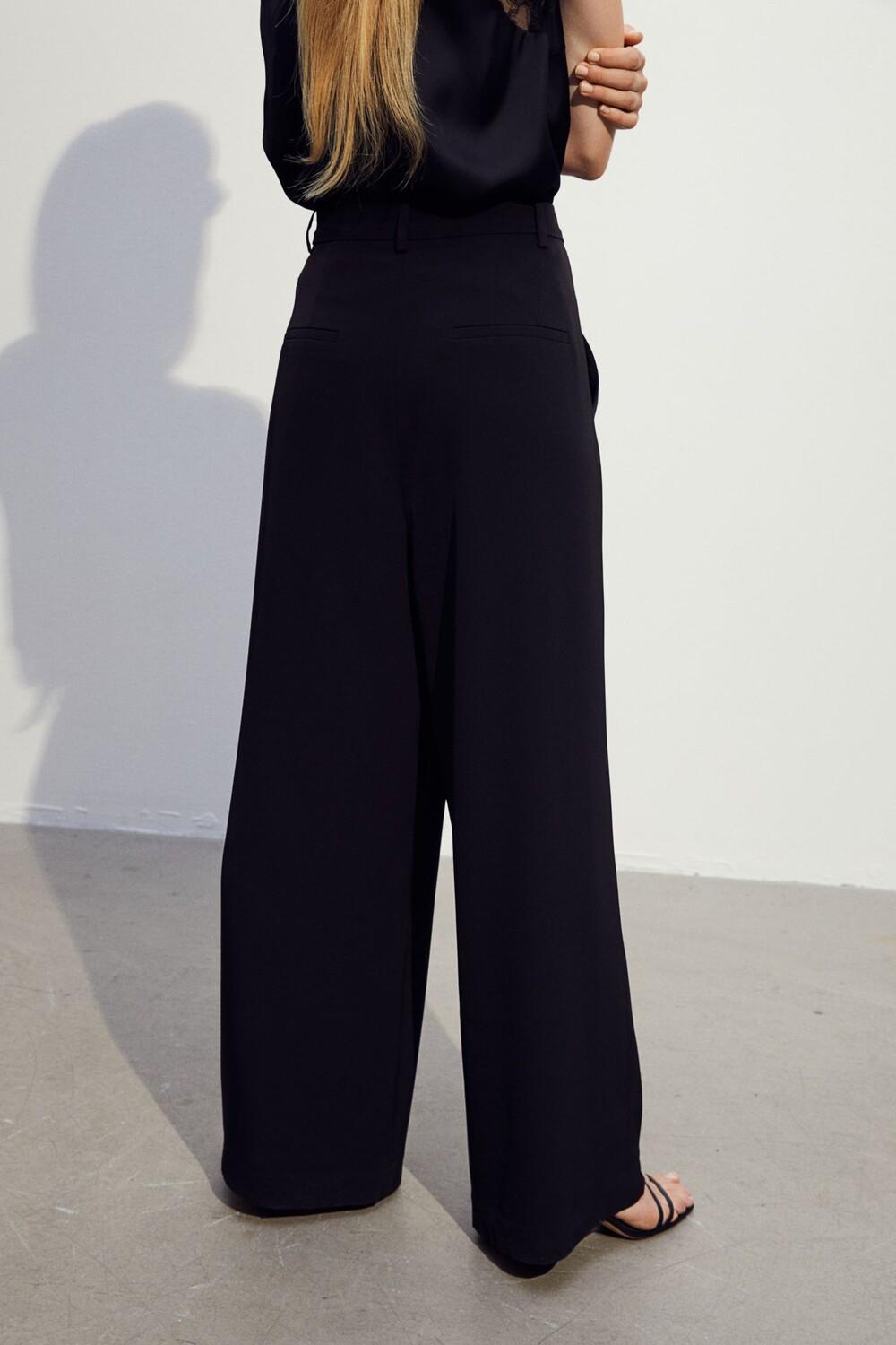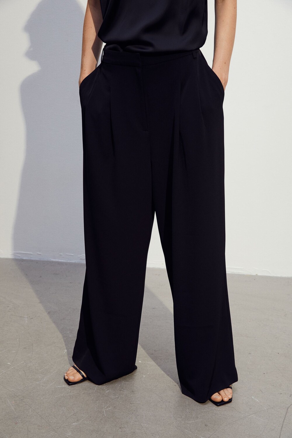 Элегантные брюки из свободной ткани. Высокая талия, потайная резинка на талии и ширинка на молнии. Диагональные боковые карманы и прорезные задние карманы. Широкие прямые штанины со складками спереди.
