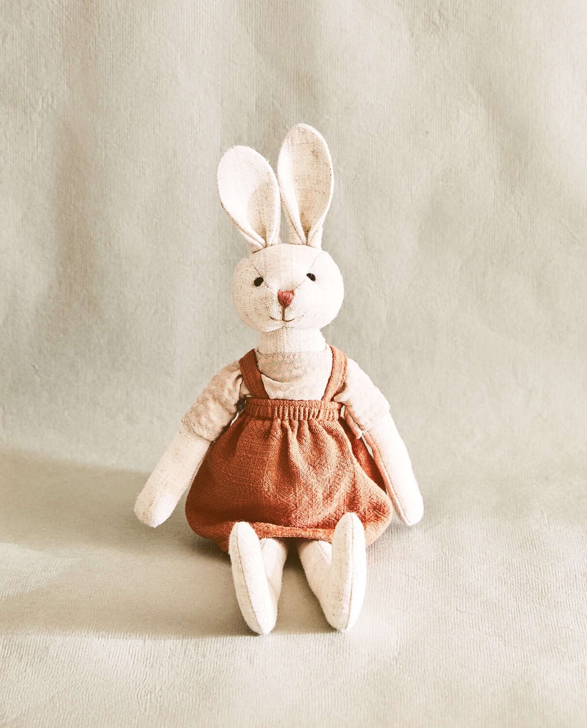 Мягкая игрушка Зайка в красновато-коричневом платье и клетчатой футболке.