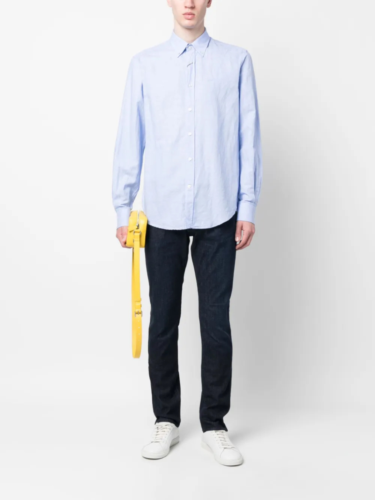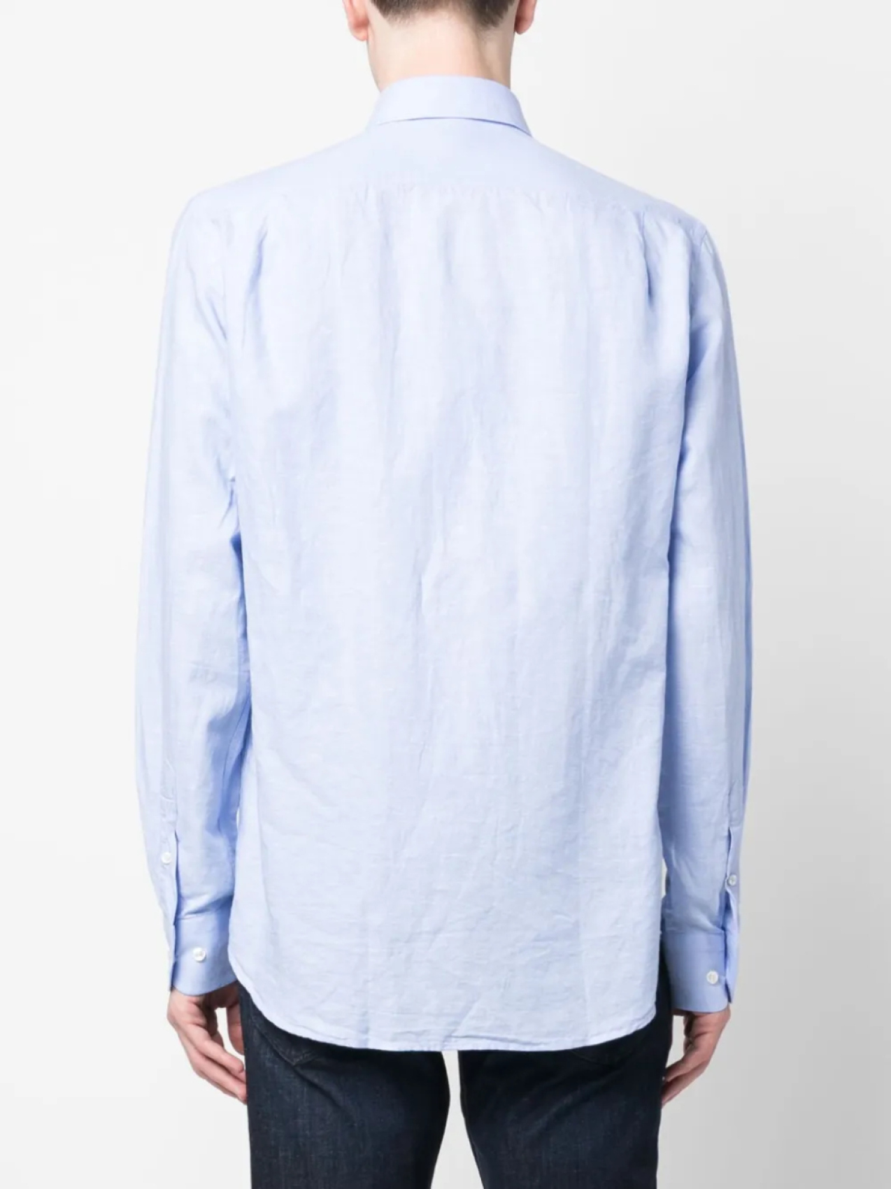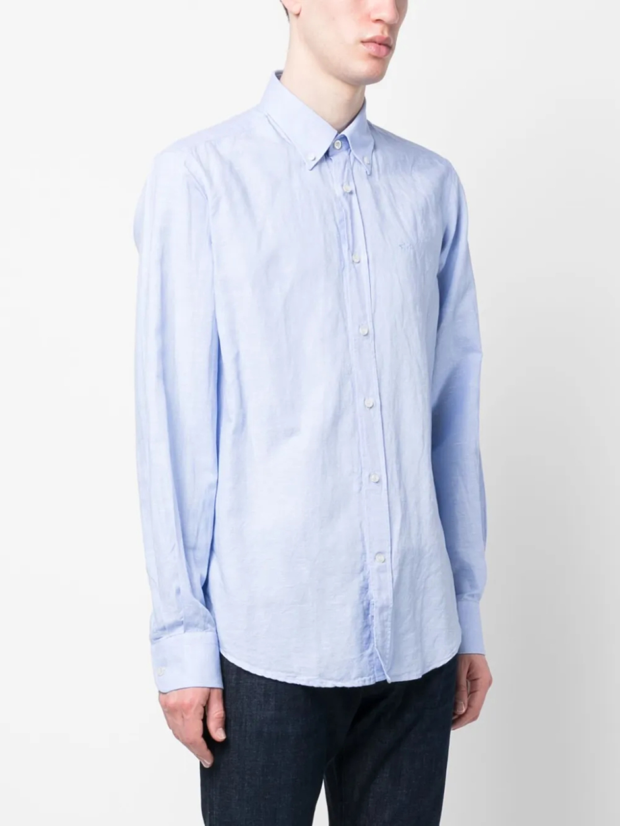Голубой, смесь хлопка и льна, вышитый логотип на груди, воротник на пуговицах, застежка на пуговицах спереди, длинные рукава, манжеты на пуговицах и закругленный подол.