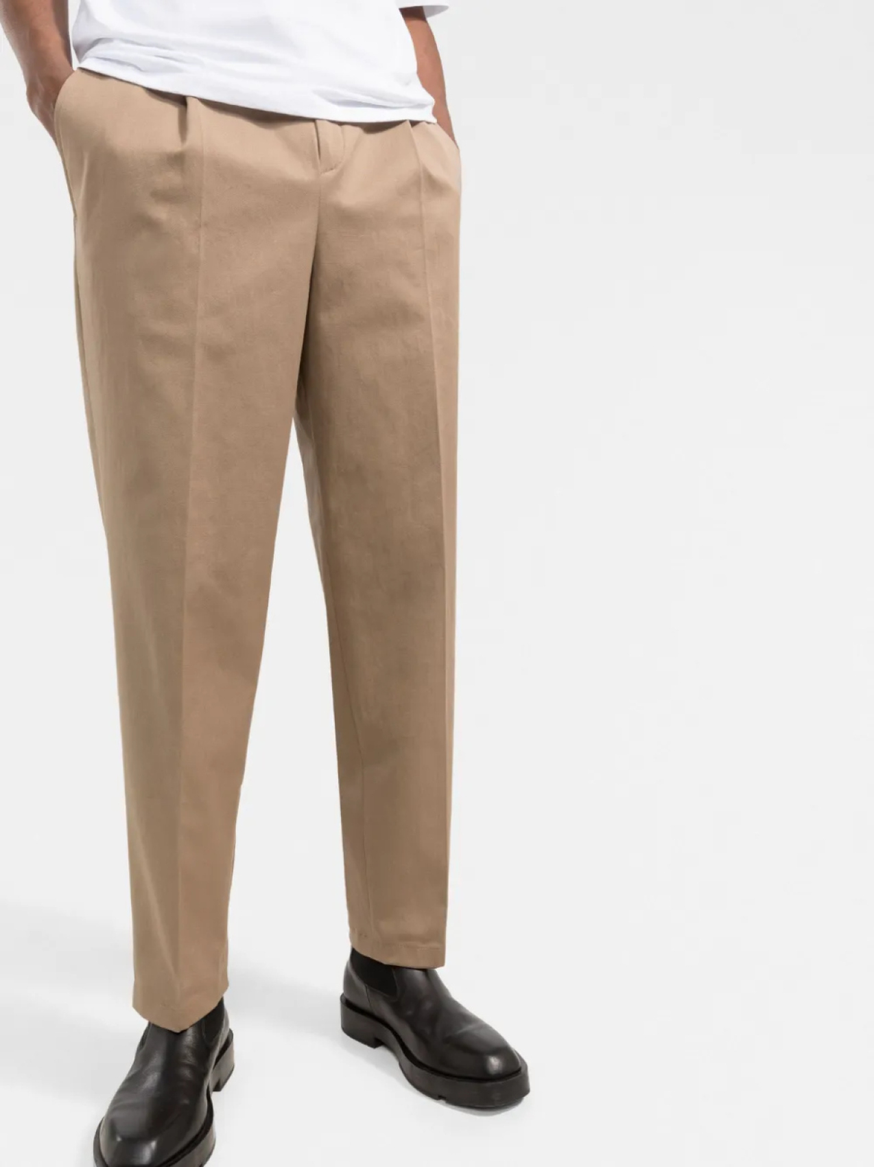 Однотонная расцветка, застежка на молнии и пуговице спереди, петли для ремня, два прорезных кармана по бокам, прямой крой, стрелки и два кармана с листочкой сзади. Цвет: телесный.