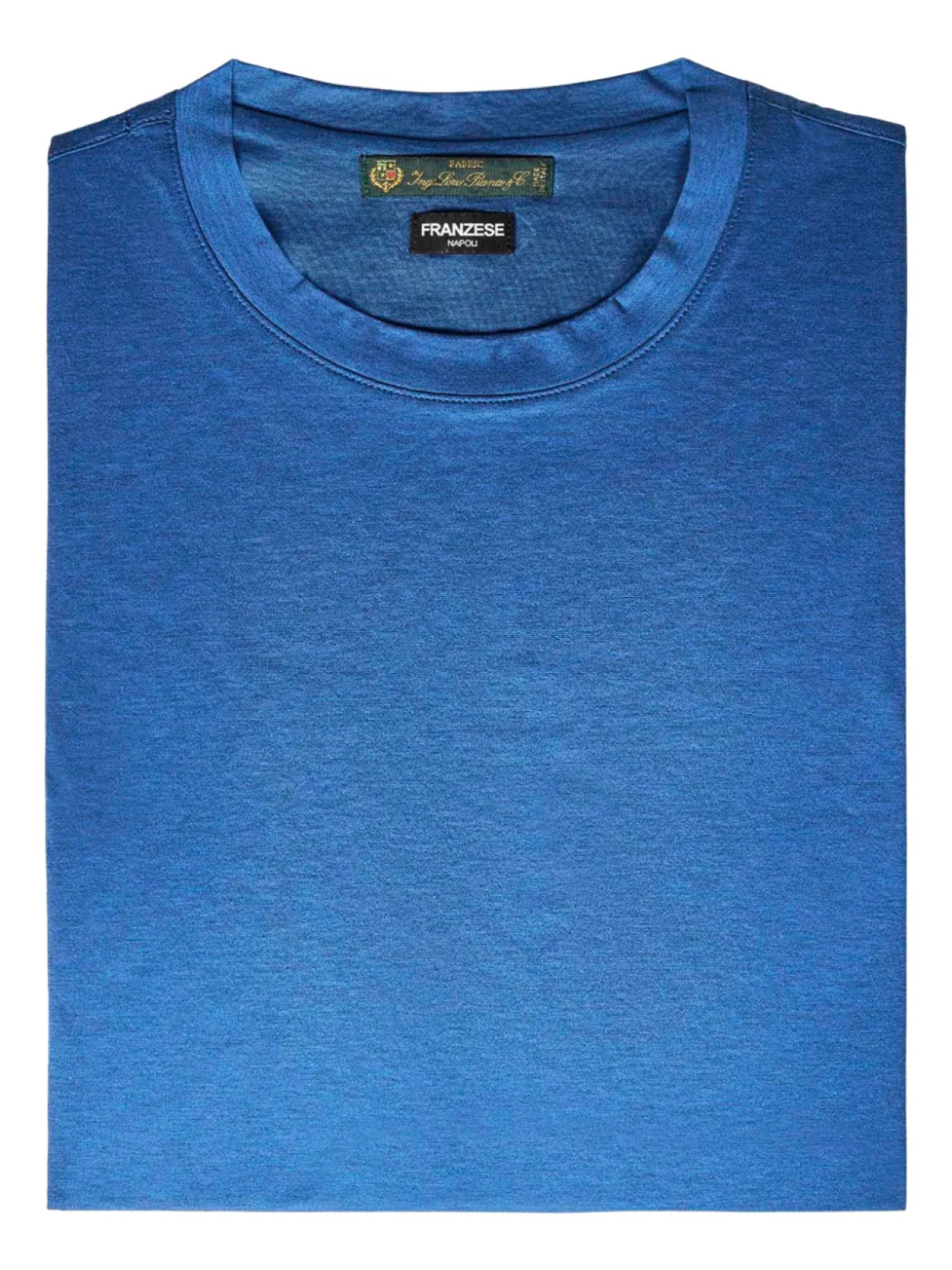 Меланжевый эффект морского синего цвета, круглый вырез горловины, короткие рукава, прямой подол