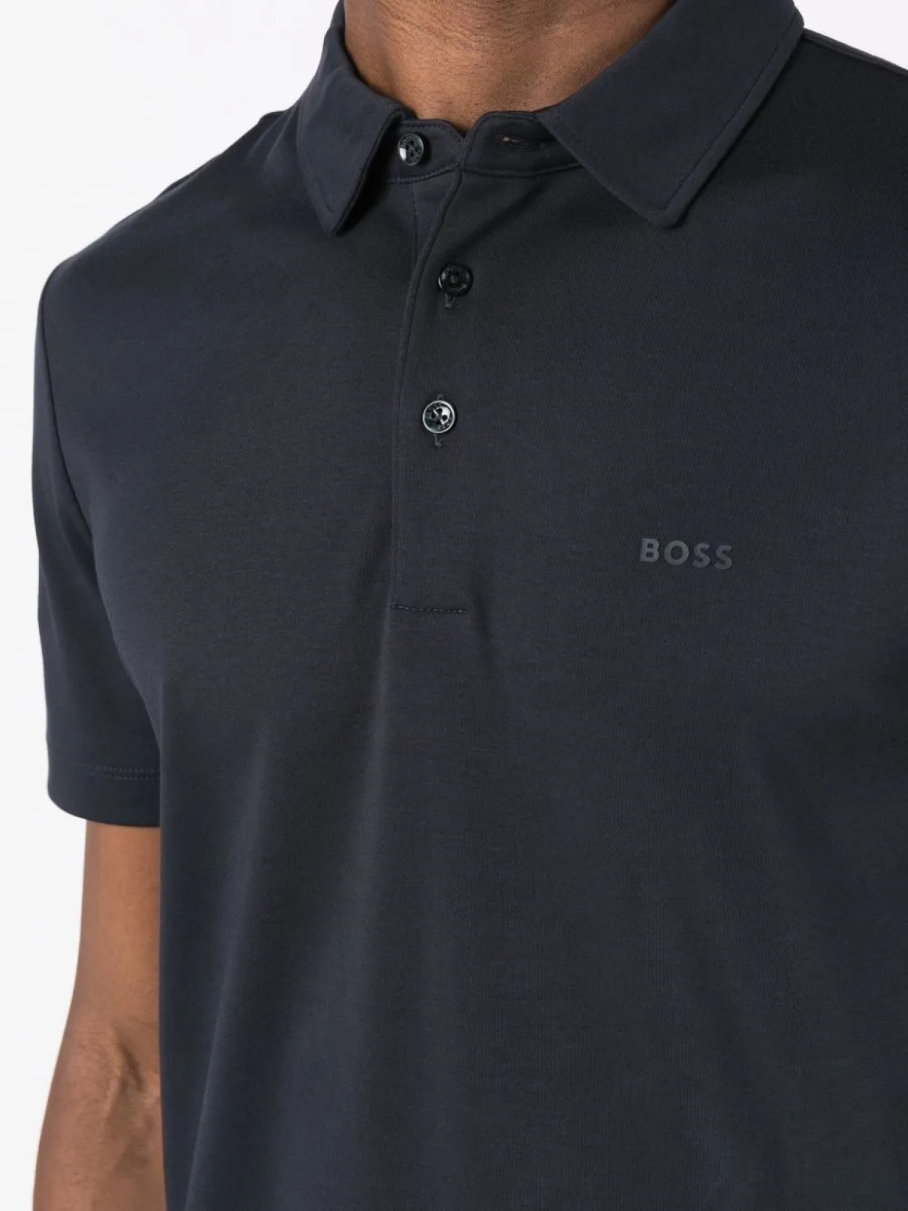 Темно-синий, хлопок, принт с логотипом на груди, воротник поло, короткая застежка на пуговицах спереди, короткие рукава и прямой подол.