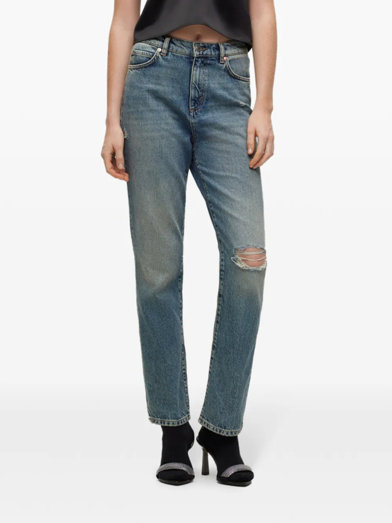 Пудрово-голубой, хлопок, обработанный деним, модель с прорезями, петли для ремня, потайная застежка на молнии и пуговицах, пять карманов и зауженный крой.