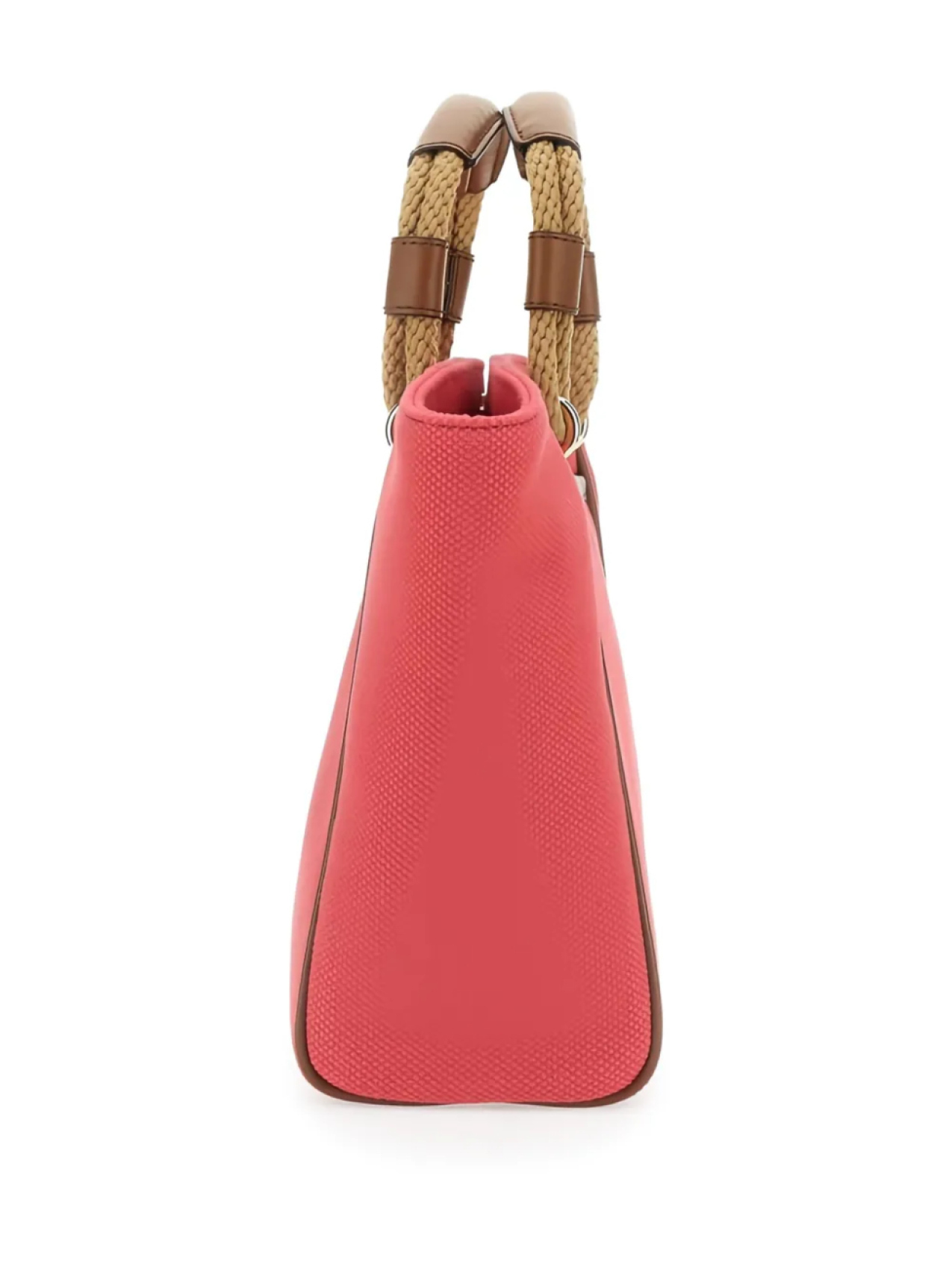 Фуксия, фактурная отделка, логотип, нашивка с логотипом внутри, магнитная застежка, съемный регулируемый ремень на плечо, две закругленные верхние ручки, внутренний карман на молнии, внутренний прорезной карман и основное отделение.
