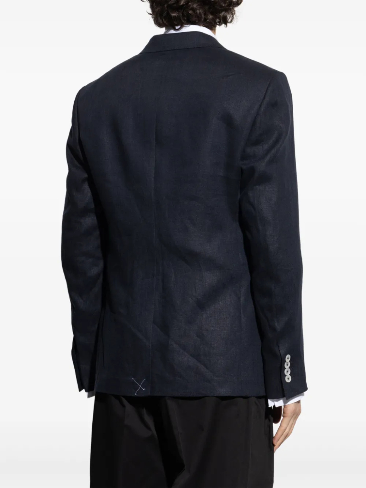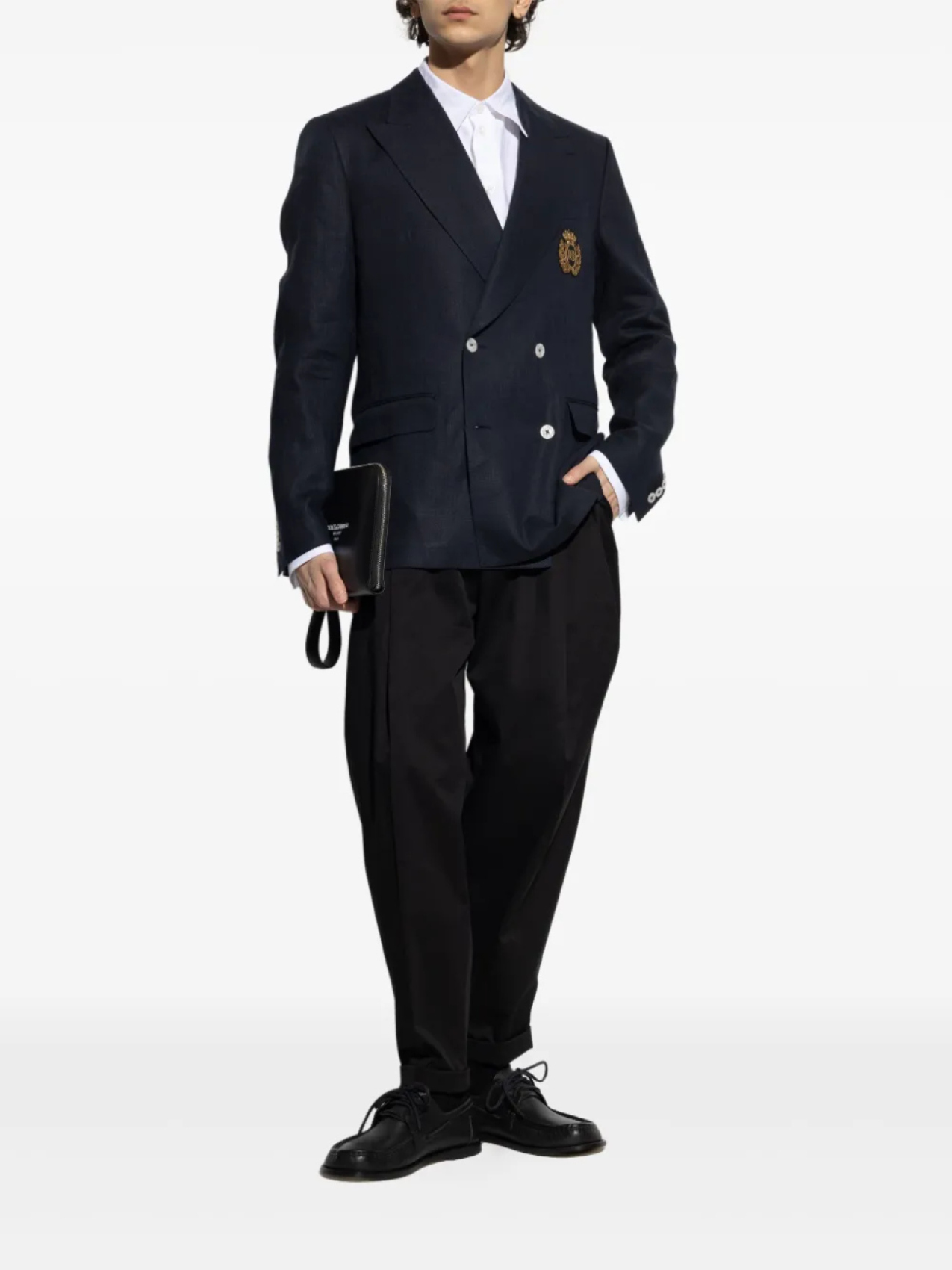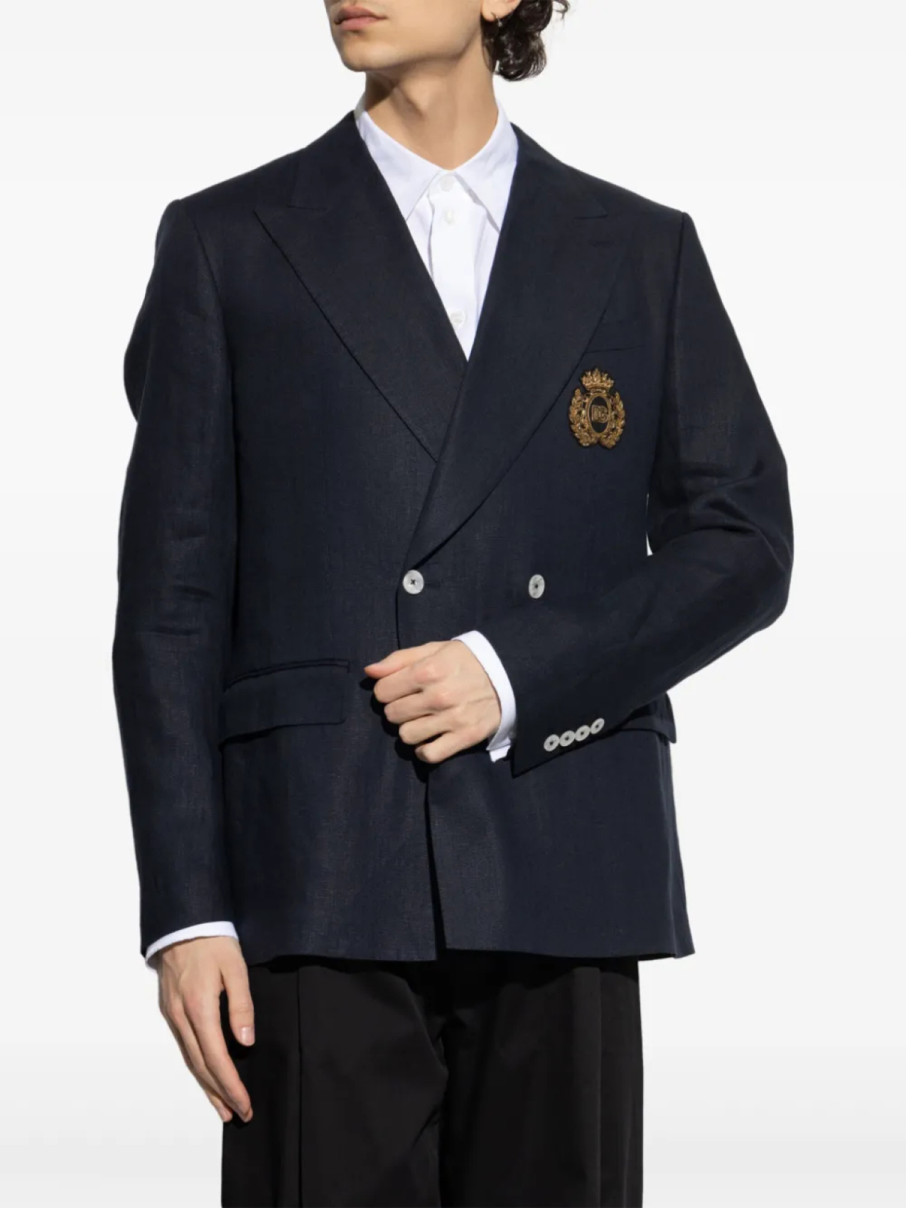 Двубортный пиджак темно-синего цвета с вышитым гербом, заостренными лацканами, застежкой на пуговицы спереди, двумя передними карманами, контрастными пуговицами, подкладкой по всей длине и подплечниками, стильным силуэтом.