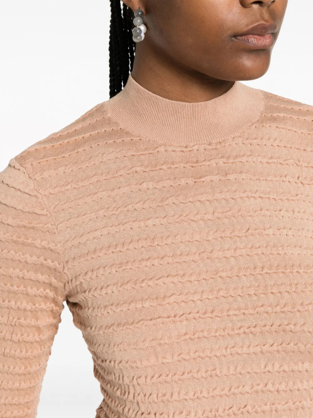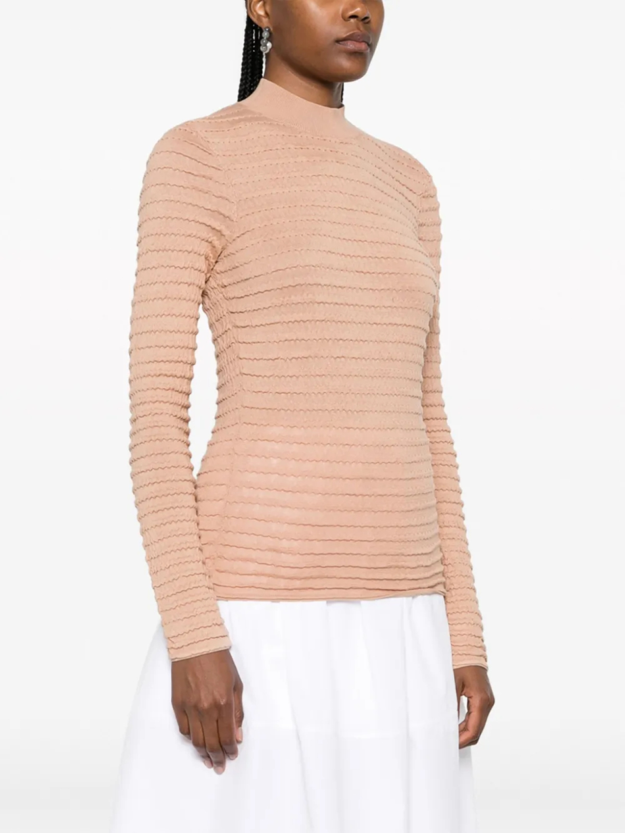 Расцветка Blush Beige, смесь хлопка и шелка, трикотажный материал, отделка со сборками, края в рубчик, высокий воротник, длинные рукава и прямой подол.