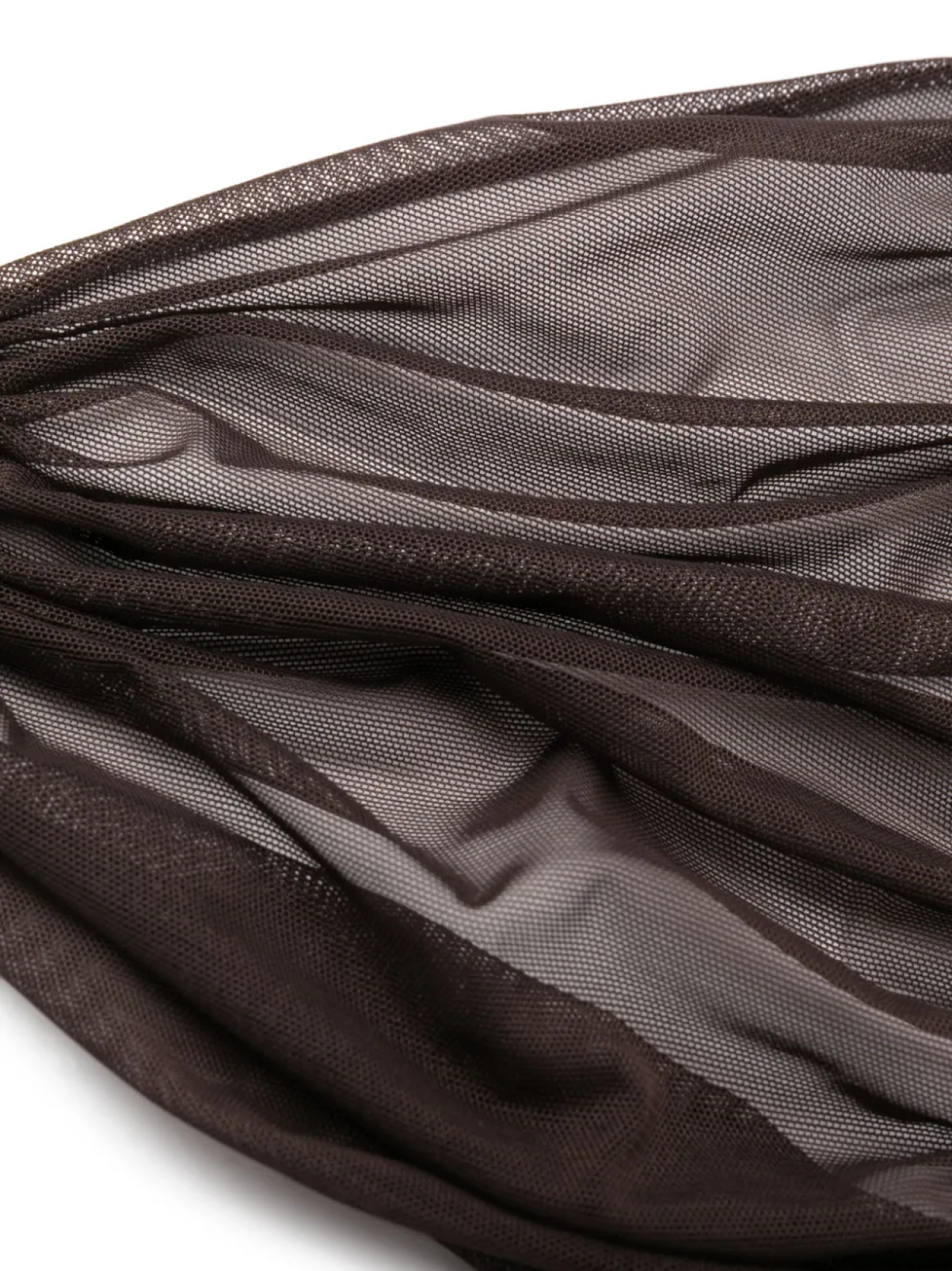 Кофейный, эластичный материал, прозрачное покрытие, сетчатый тюль, серебристая фурнитура, металлические кольца, дизайн со сборками, вырез-петля халтер и застежка на завязке сзади. Эту вещь можно примерить, но только поверх собственного белья.
