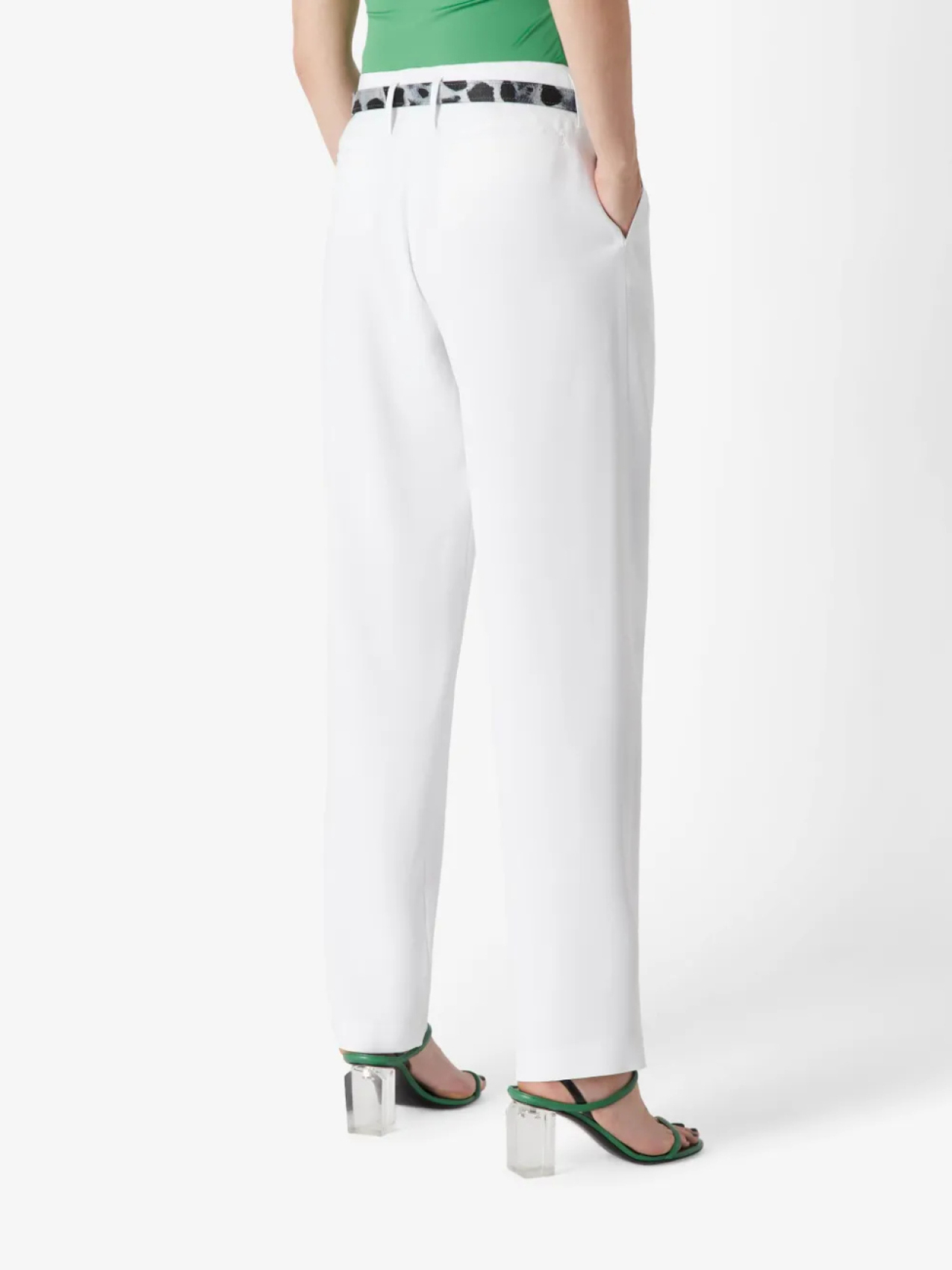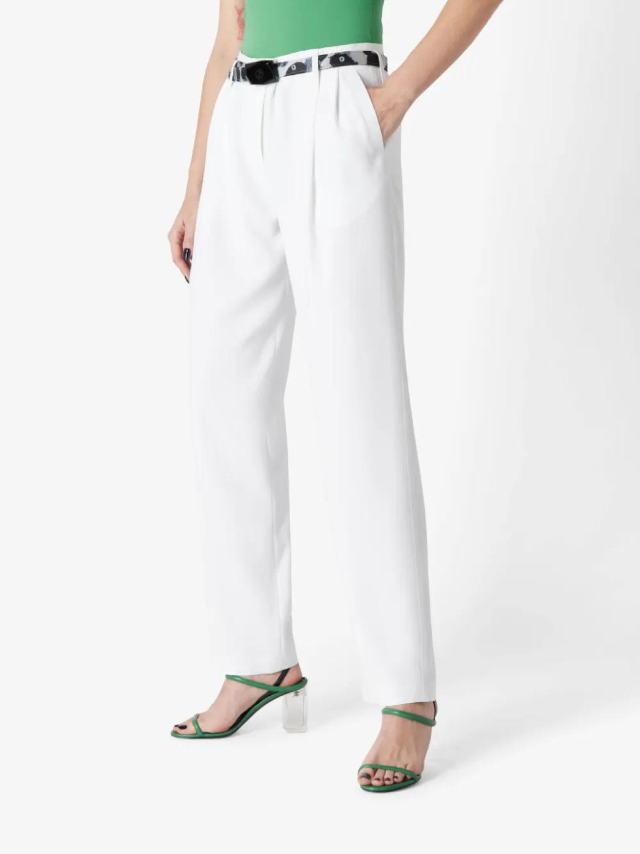 Белый, складки, строгий крой, прямой крой, средняя посадка, потайная застежка спереди, петли для ремня, два прорезных кармана по бокам и два кармана с листочкой сзади.