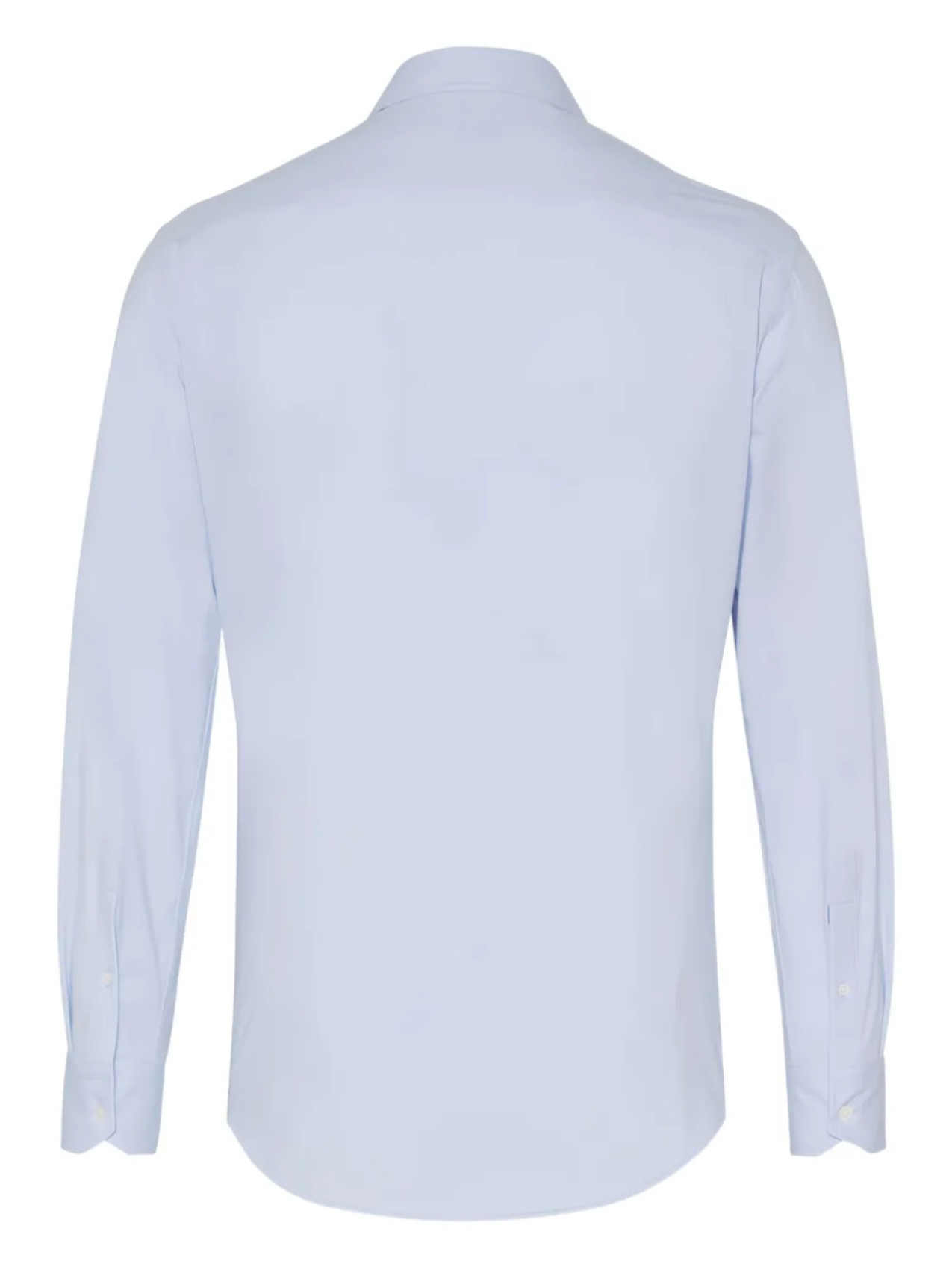 Светло-голубые длинные рукава, вырезной воротник, застежка на пуговицы спереди, закругленный подол, манжеты на одной пуговице