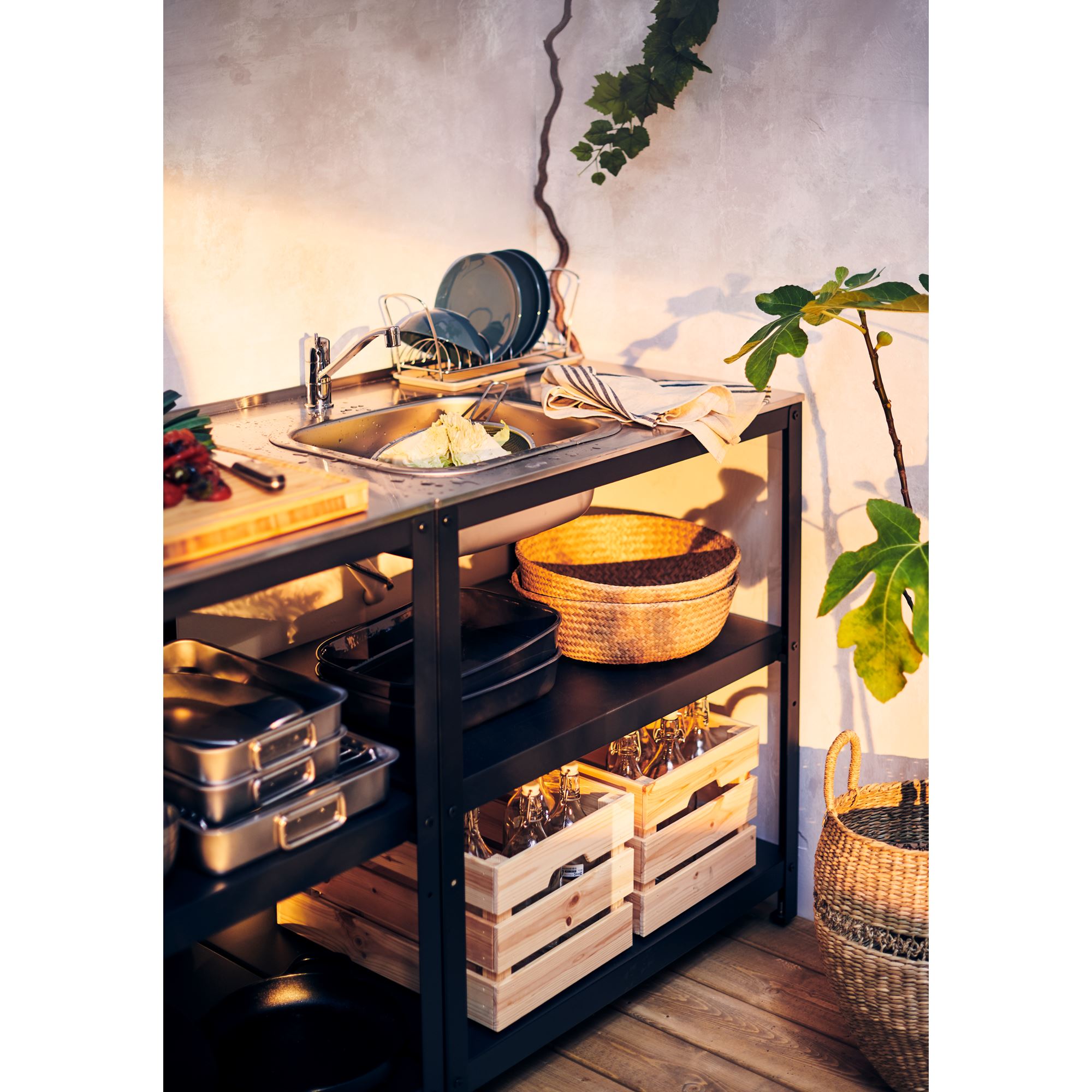 Идеальное начало для практичной мойки для использования на открытом воздухе — просто добавьте мойку FYNDIG и кран KALLSJÖN.