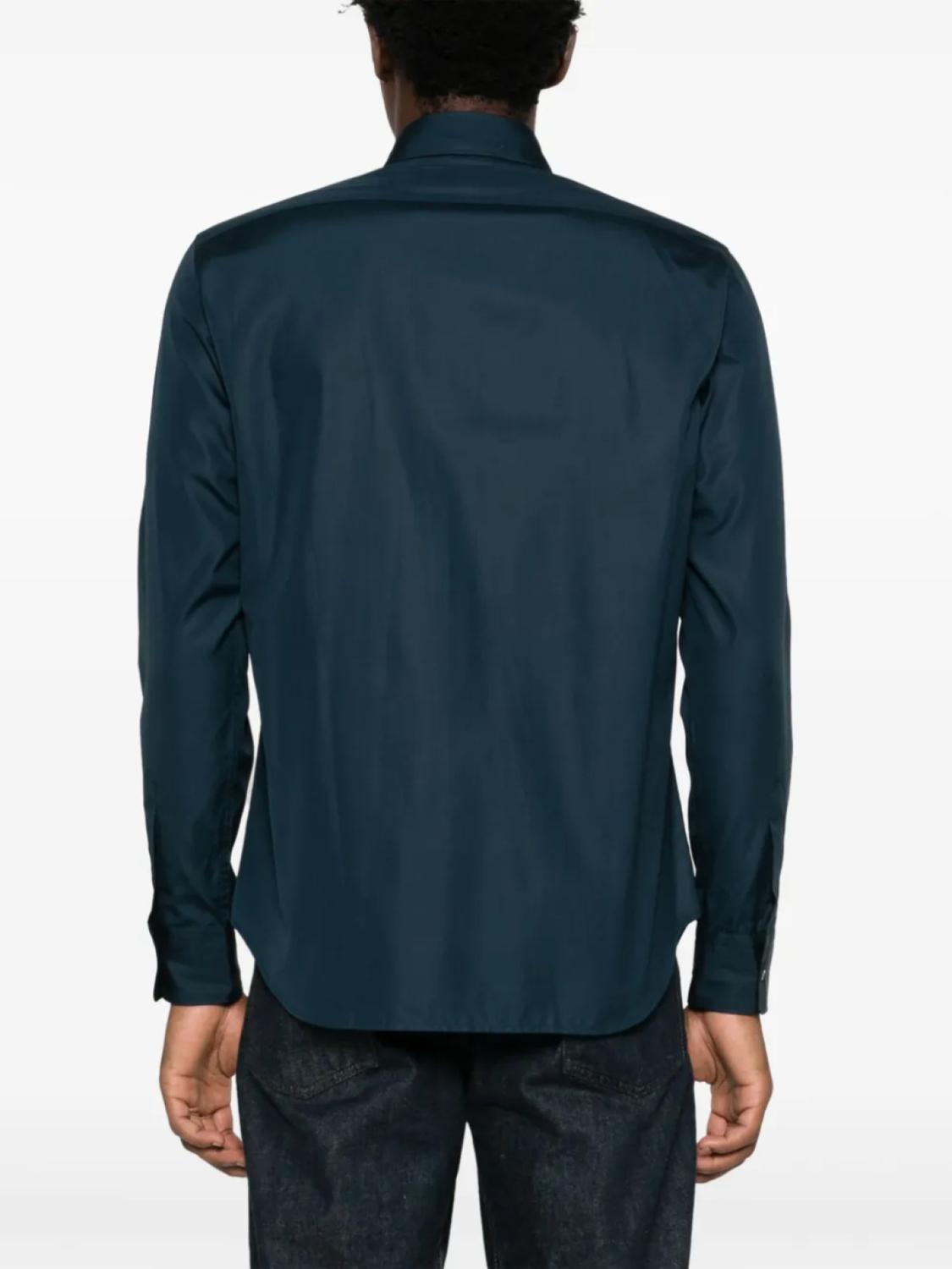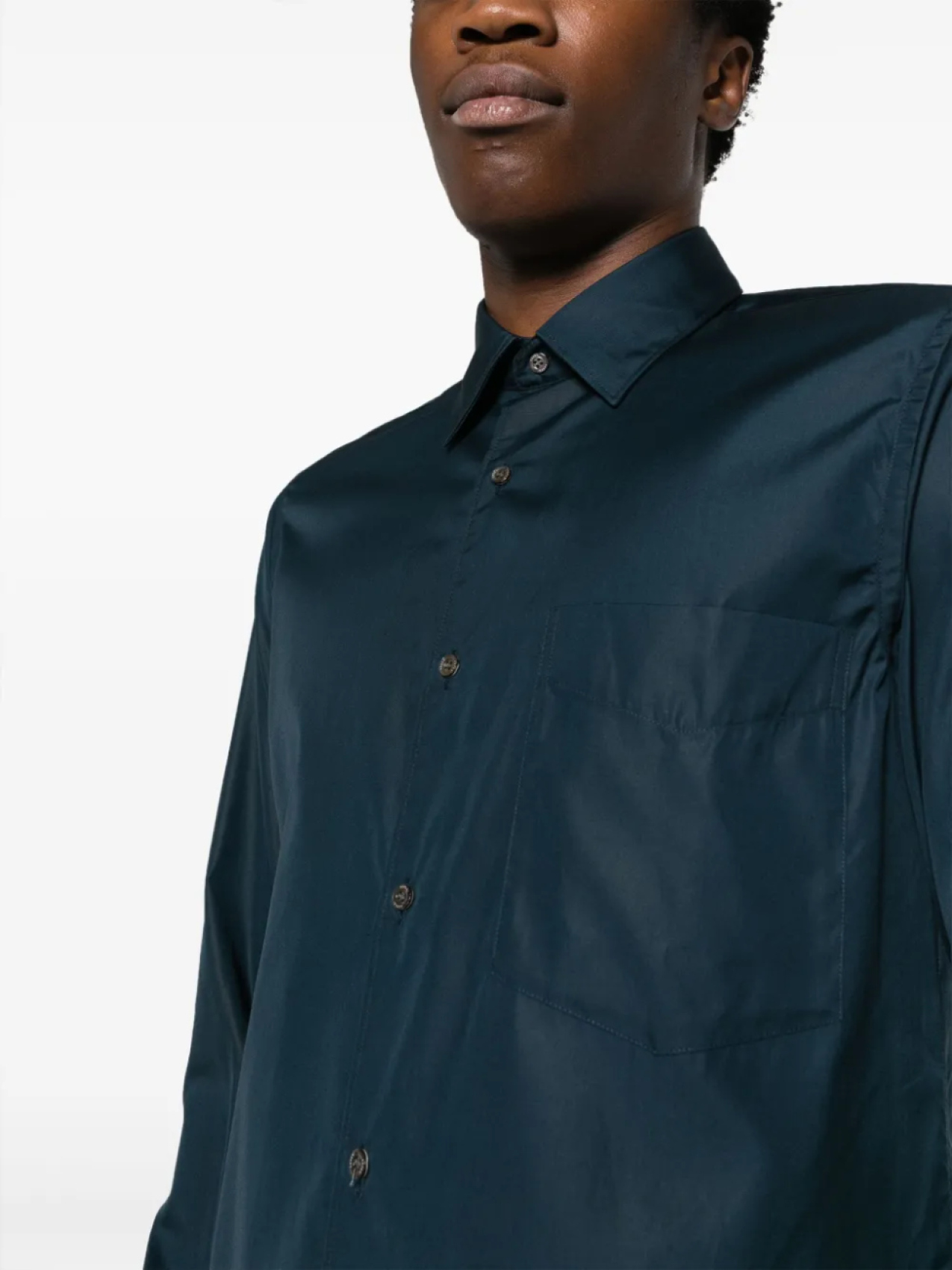 Индиго, хлопок, нагрудный накладной карман, классический воротник, застежка на пуговицах спереди, длинные рукава, рукава с манжетами на пуговицах и закругленный подол.