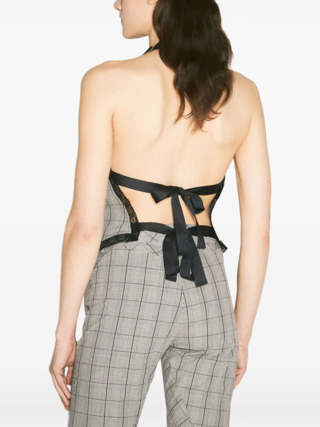 Светло-серый, завязывается на шее через шею, завязывается сзади, накладной нагрудный карман, асимметричный подол