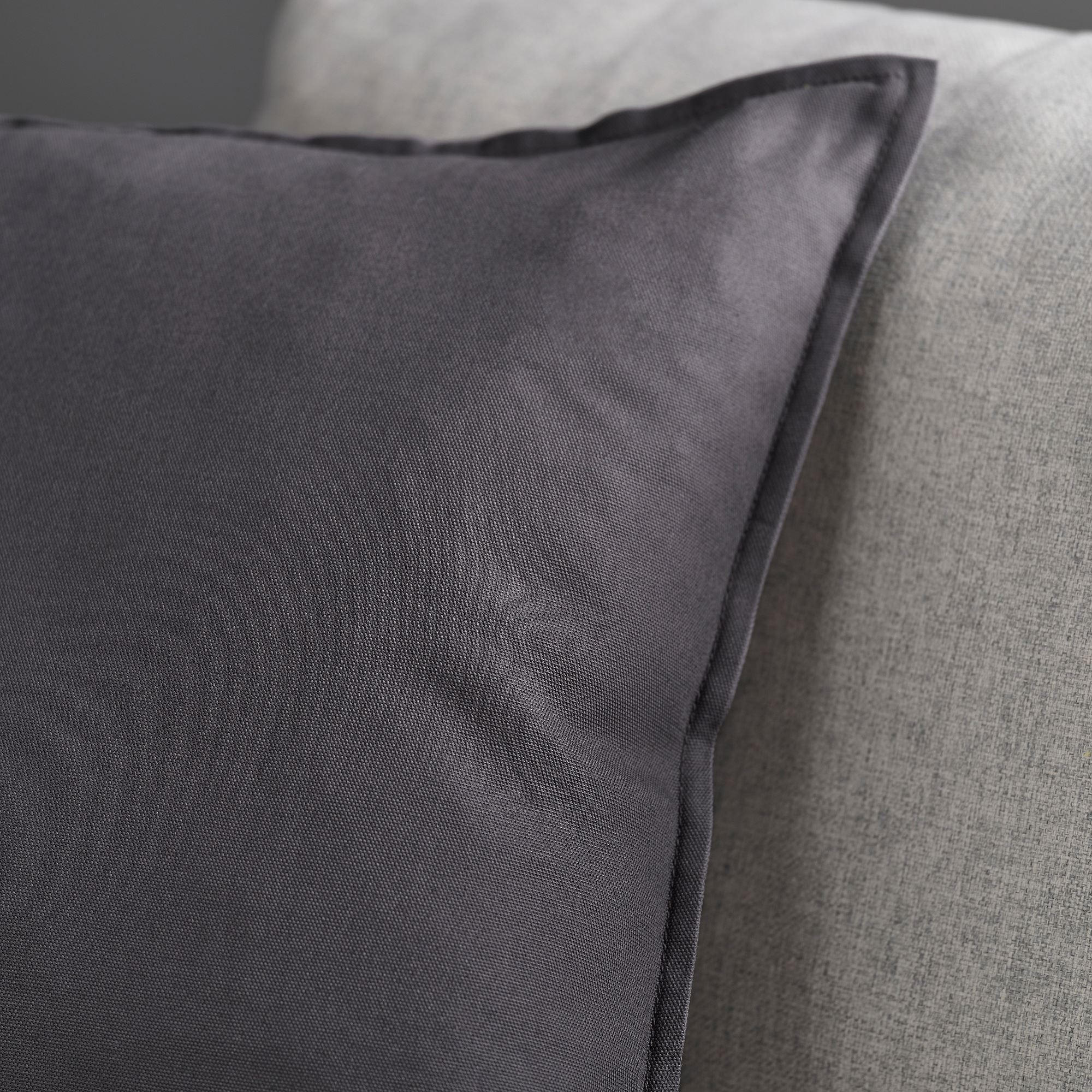 Чехол на подушку темно-серого цвета из хлопка, 50% которого переработано. Хорошо сочетается с узорчатыми или другими однотонными подушками из нашего ассортимента, а большой размер очень удобен для чтения в постели.