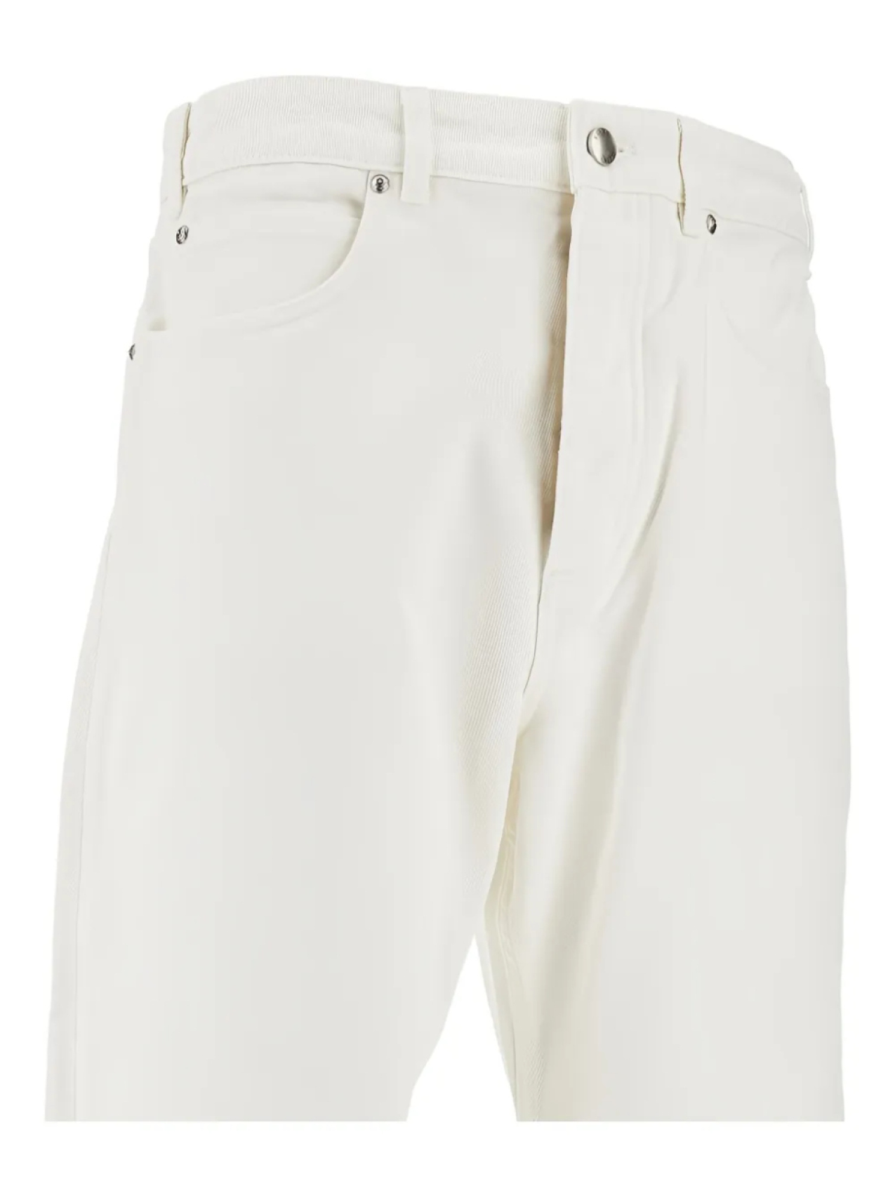 Кремово-белая модель с пятью карманами, застежкой на пуговицы и молнию, шлевками для ремня, вышитым логотипом, тонкими акцентами в виде стежков