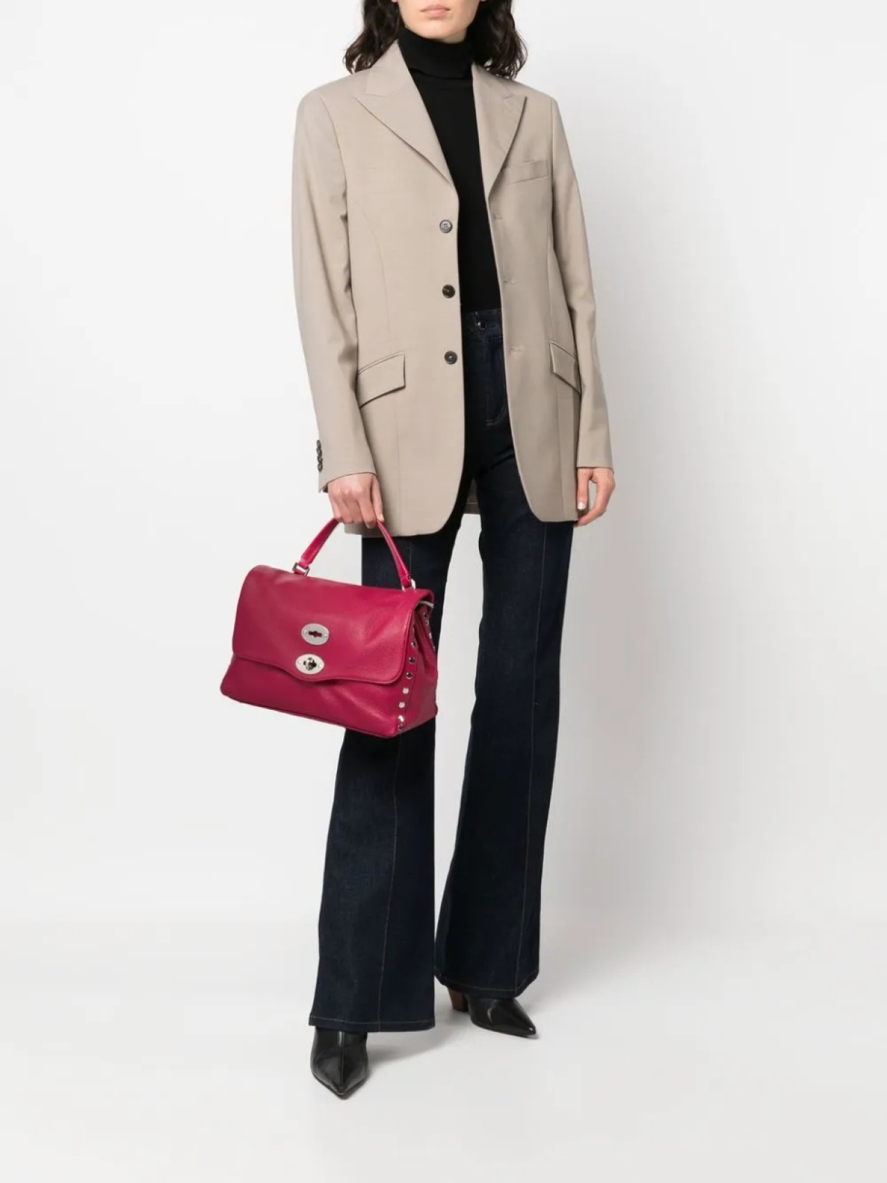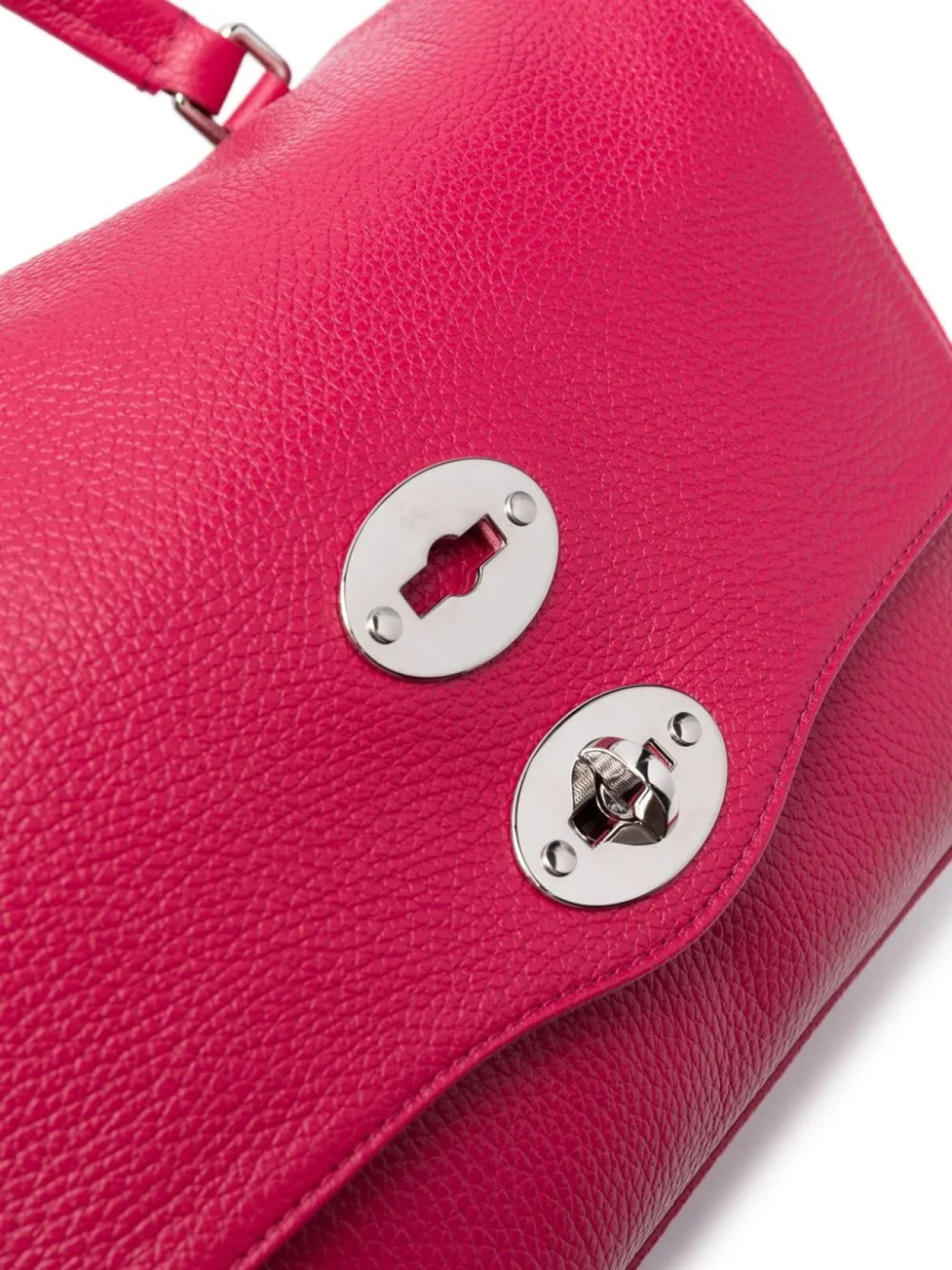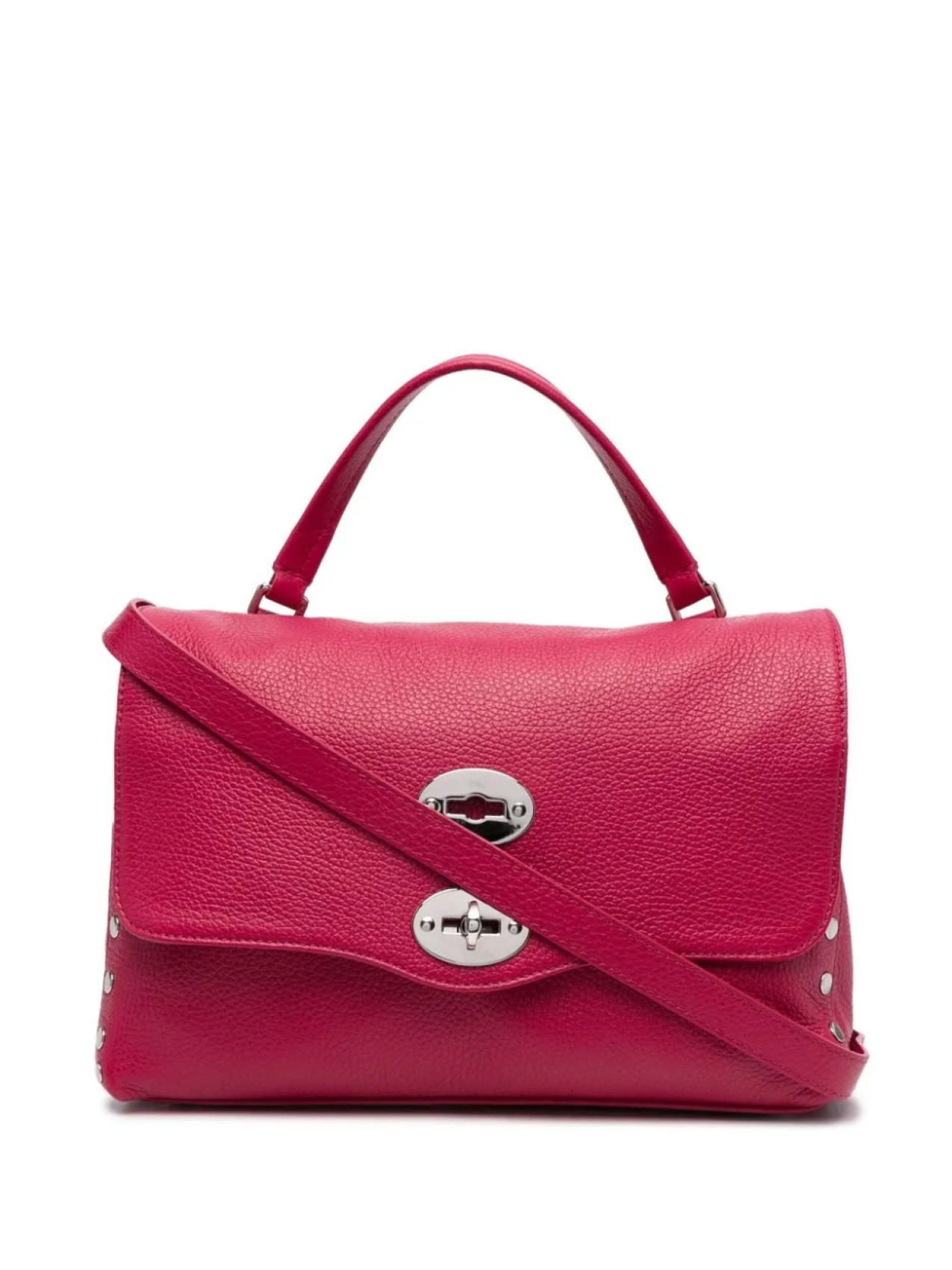 Фуксия, телячья кожа, зернистая текстура, серебристые заклепки, верхняя ручка, съемный регулируемый ремень на плечо, откидной клапан, застежка с поворачивающимся замком, несколько отделений, внутренний карман на молнии и нашивка с логотипом внутри.