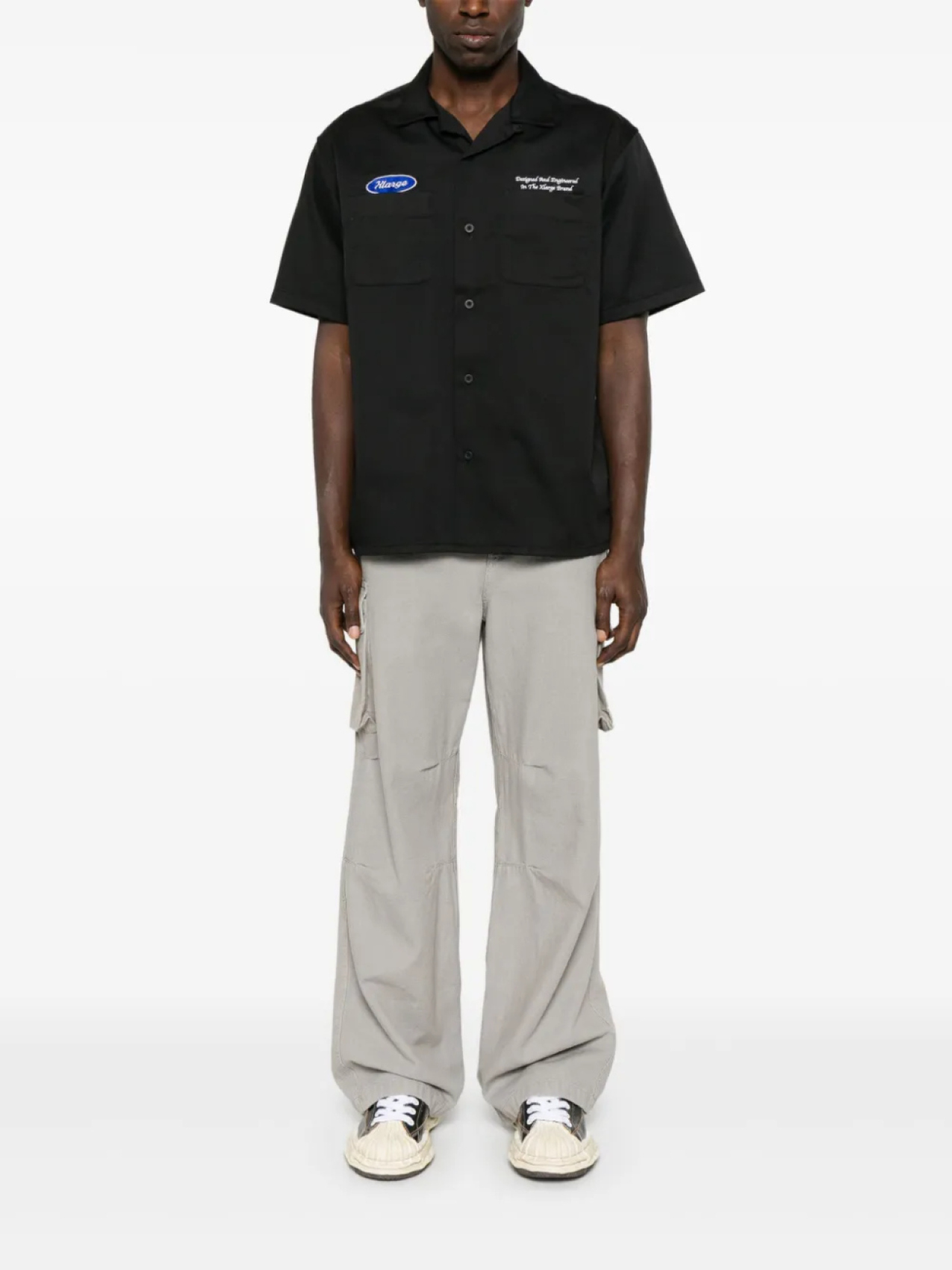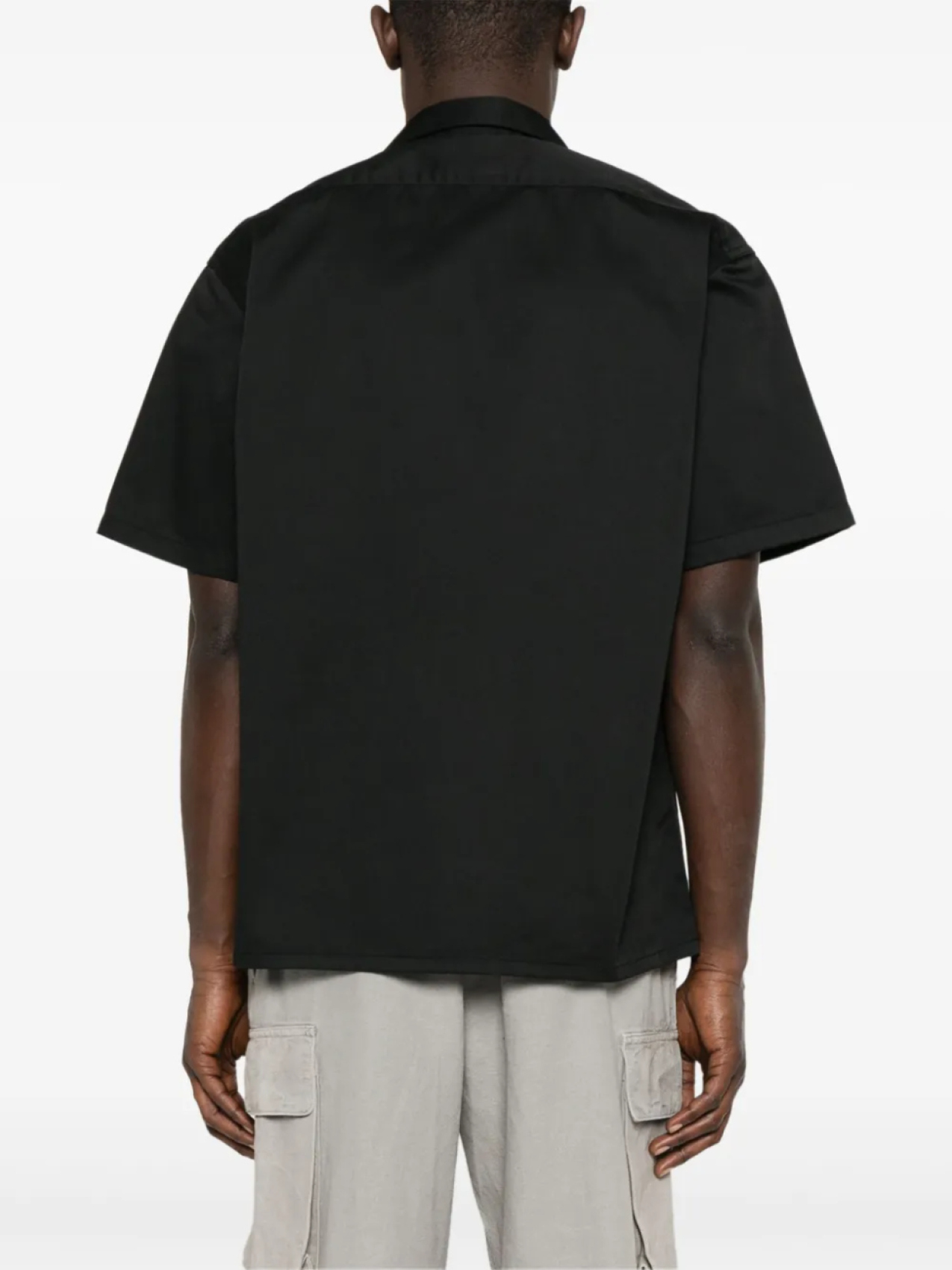 Черная застежка на пуговицы спереди, два накладных кармана на груди, короткие боковые разрезы, короткие рукава