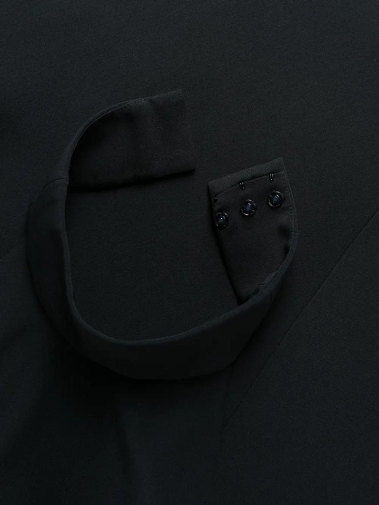 Черный, вырез-петля халтер, открытая спина, застежка на молнии сзади, без рукавов, длина миди и расклешенный подол.