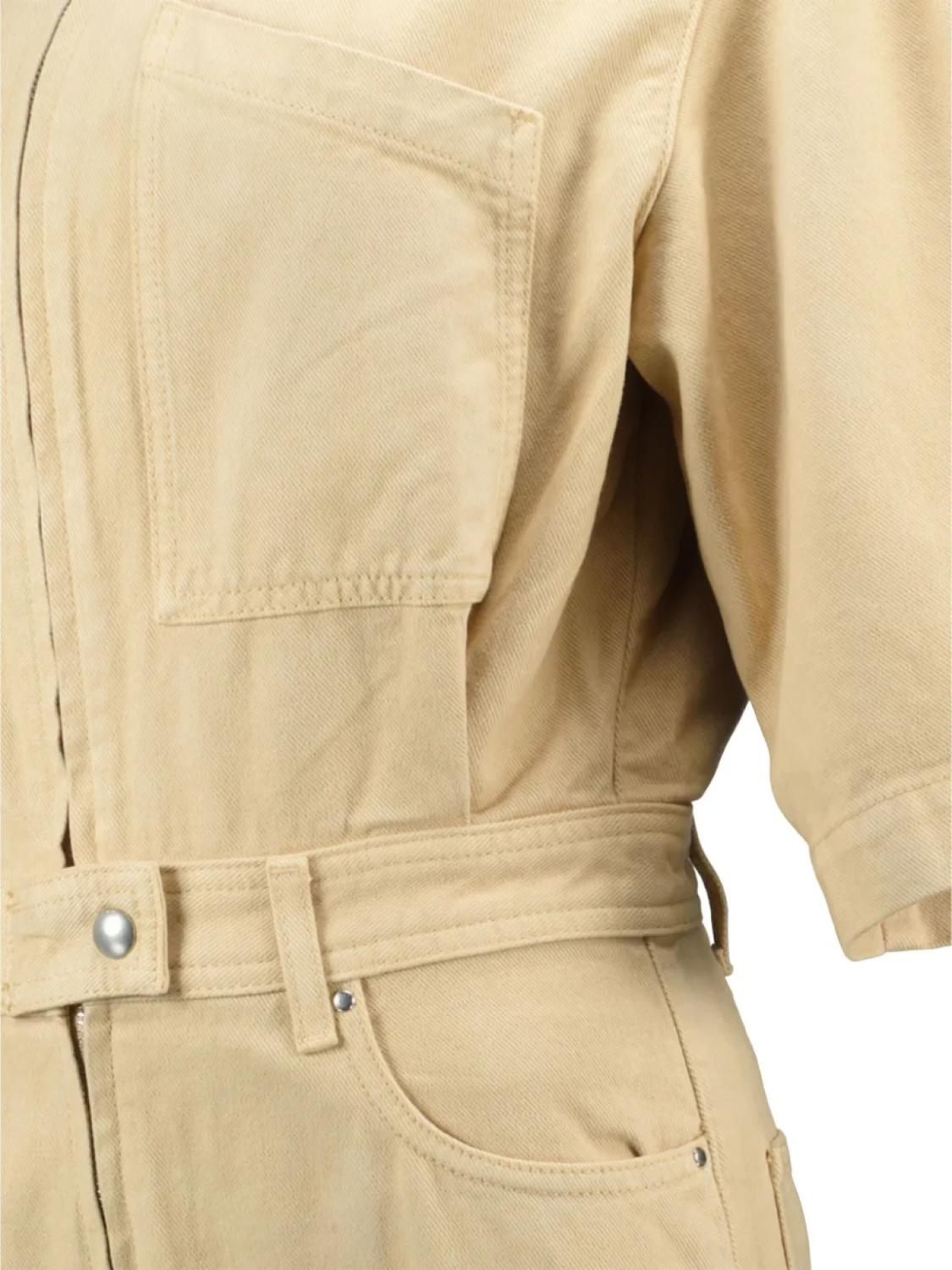 Бежевый, короткие рукава, застежка-молния спереди, пояс на талии, несколько накладных карманов, свободный крой по ногам
