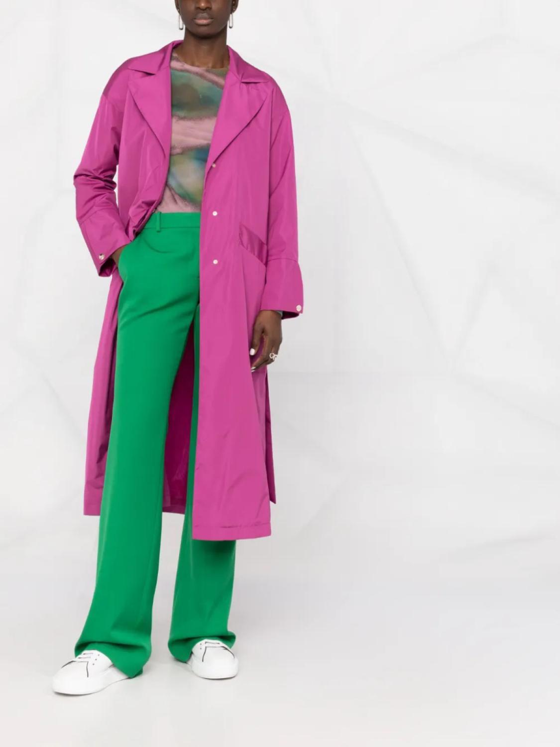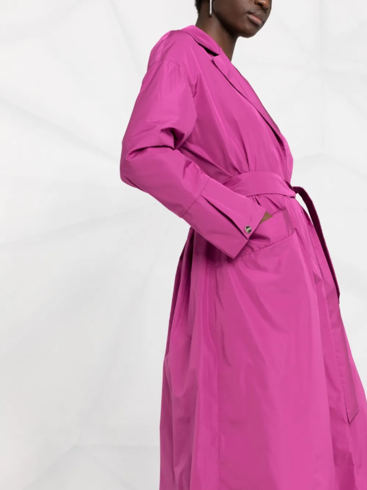 Зазубренные лацканы, застежка на кнопках спереди, ремень на талии, два передних кармана, длинные рукава, манжеты с застежкой на кнопки и боковые разрезы.