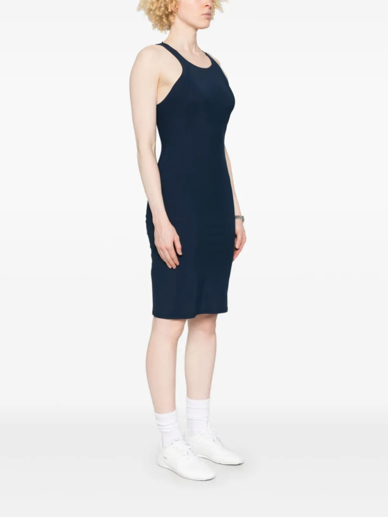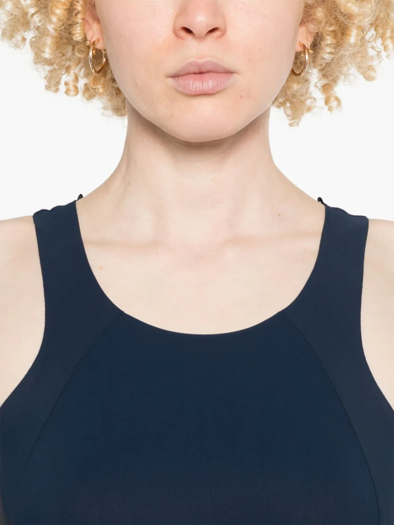 Темно-синяя модель с круглым вырезом и вставками, без рукавов