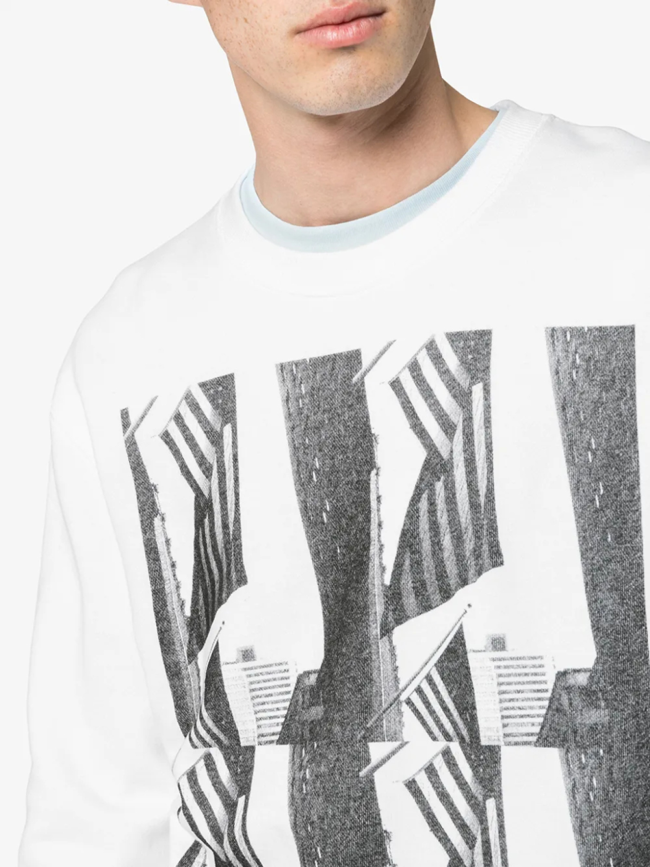 Белый топ 'Andy Warhol' с длинными рукавами и принтом от CALVIN KLEIN 205W39NYC. Круглый вырез, длинные рукава, подол и манжеты в рубчик, свободный силуэт.