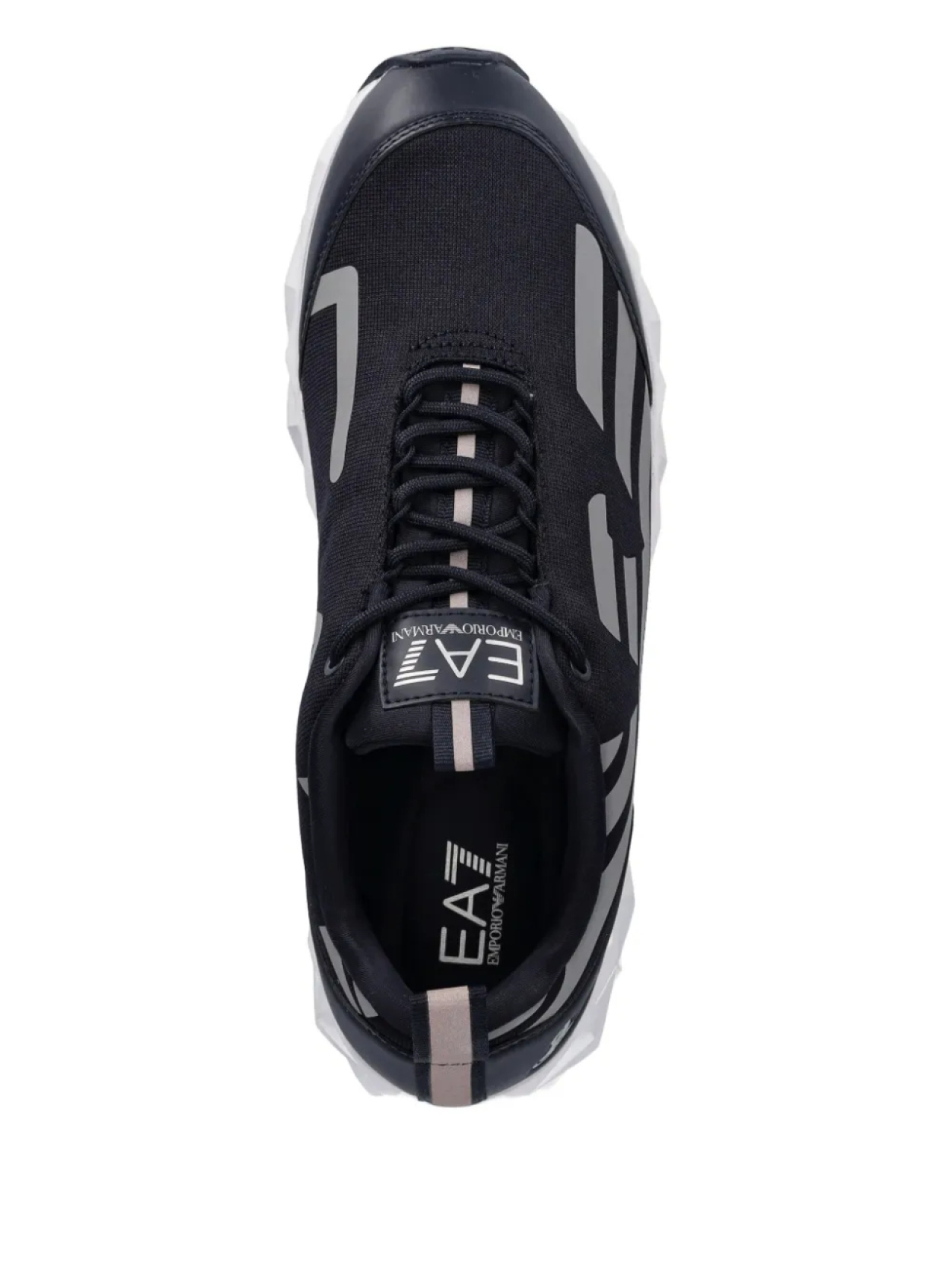 Черная шнуровка спереди, двойной язычок для подтягивания, принт с логотипом сбоку, нашивка с логотипом на язычке