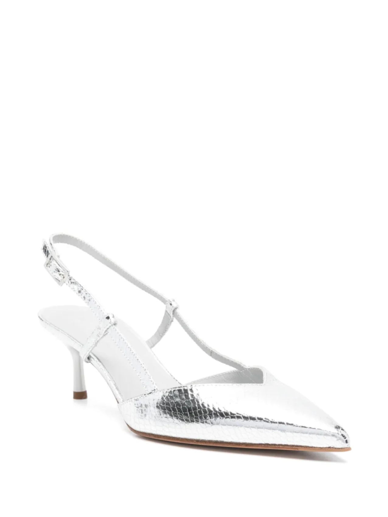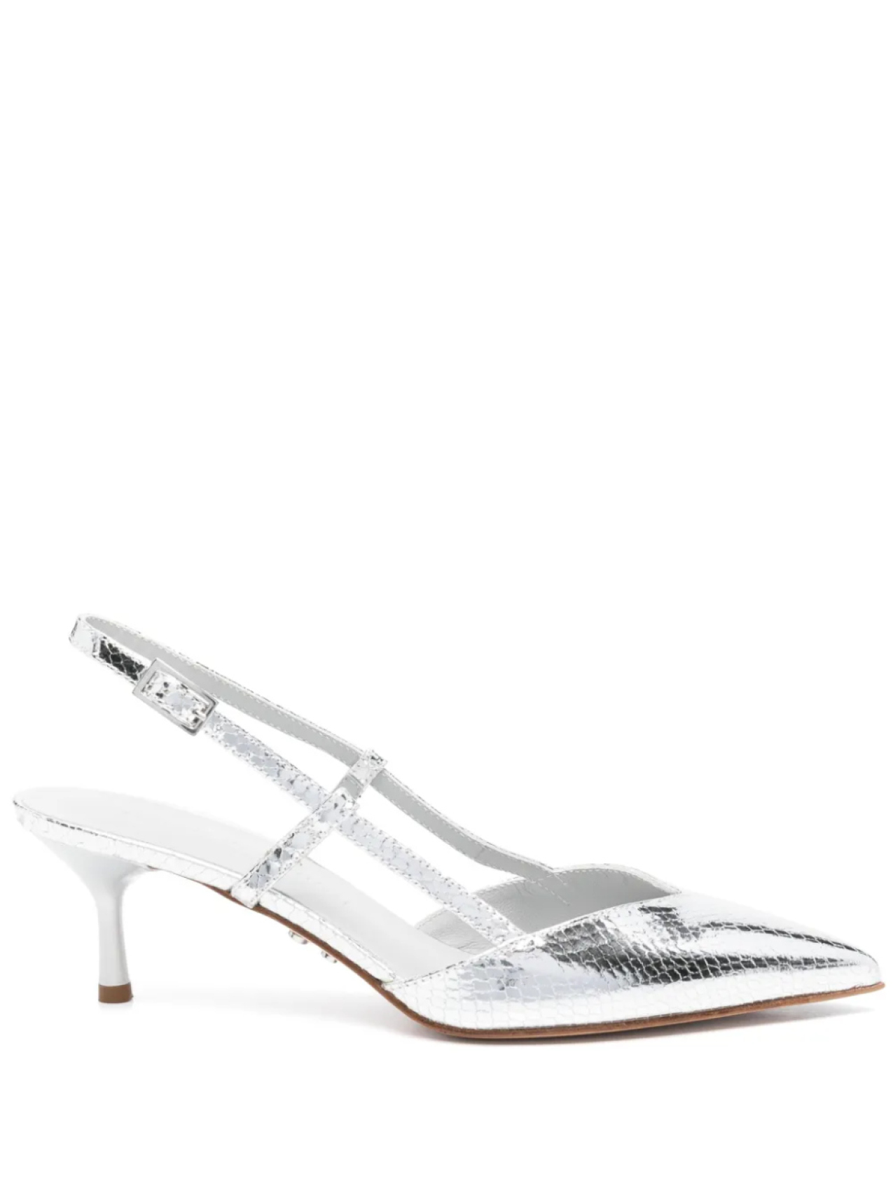 Застежка на серебристую пряжку-ремешок, фирменная кожаная стелька, каблук средней высоты, острый носок