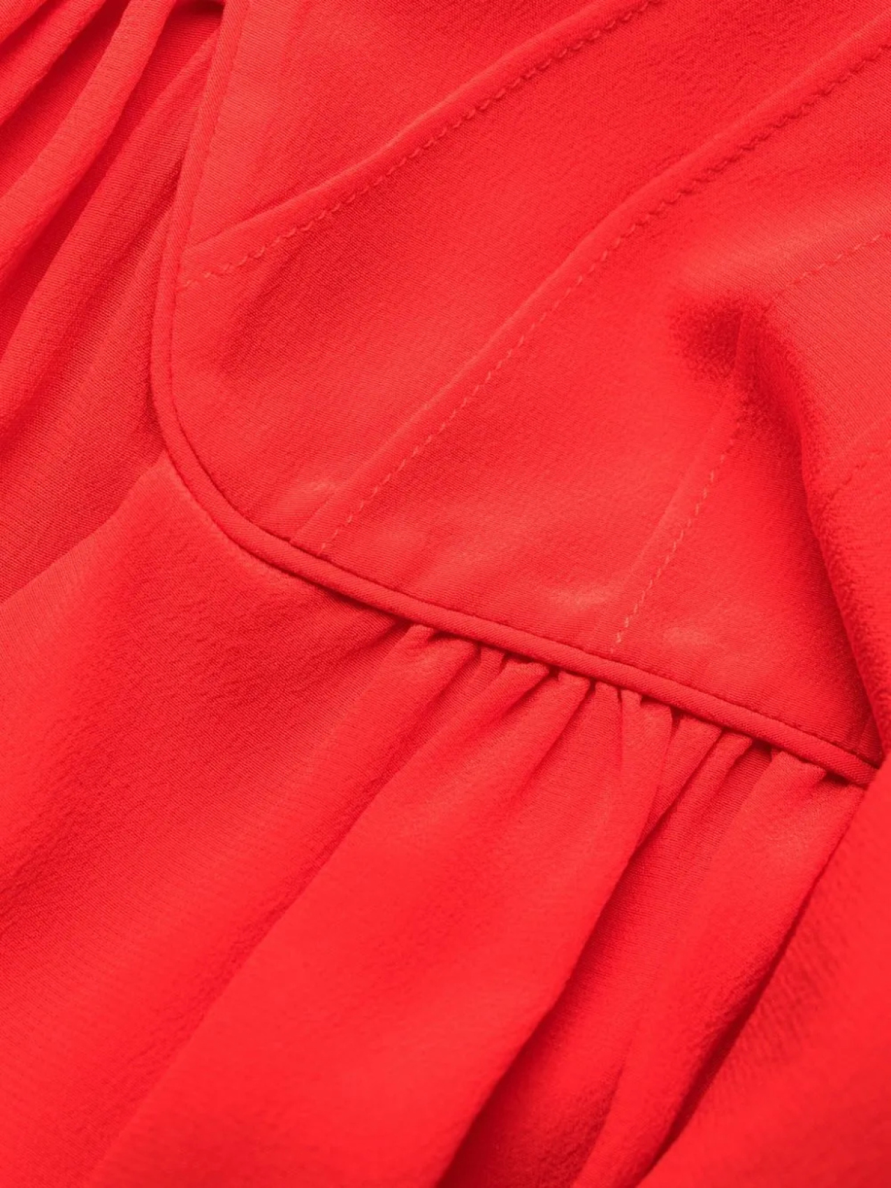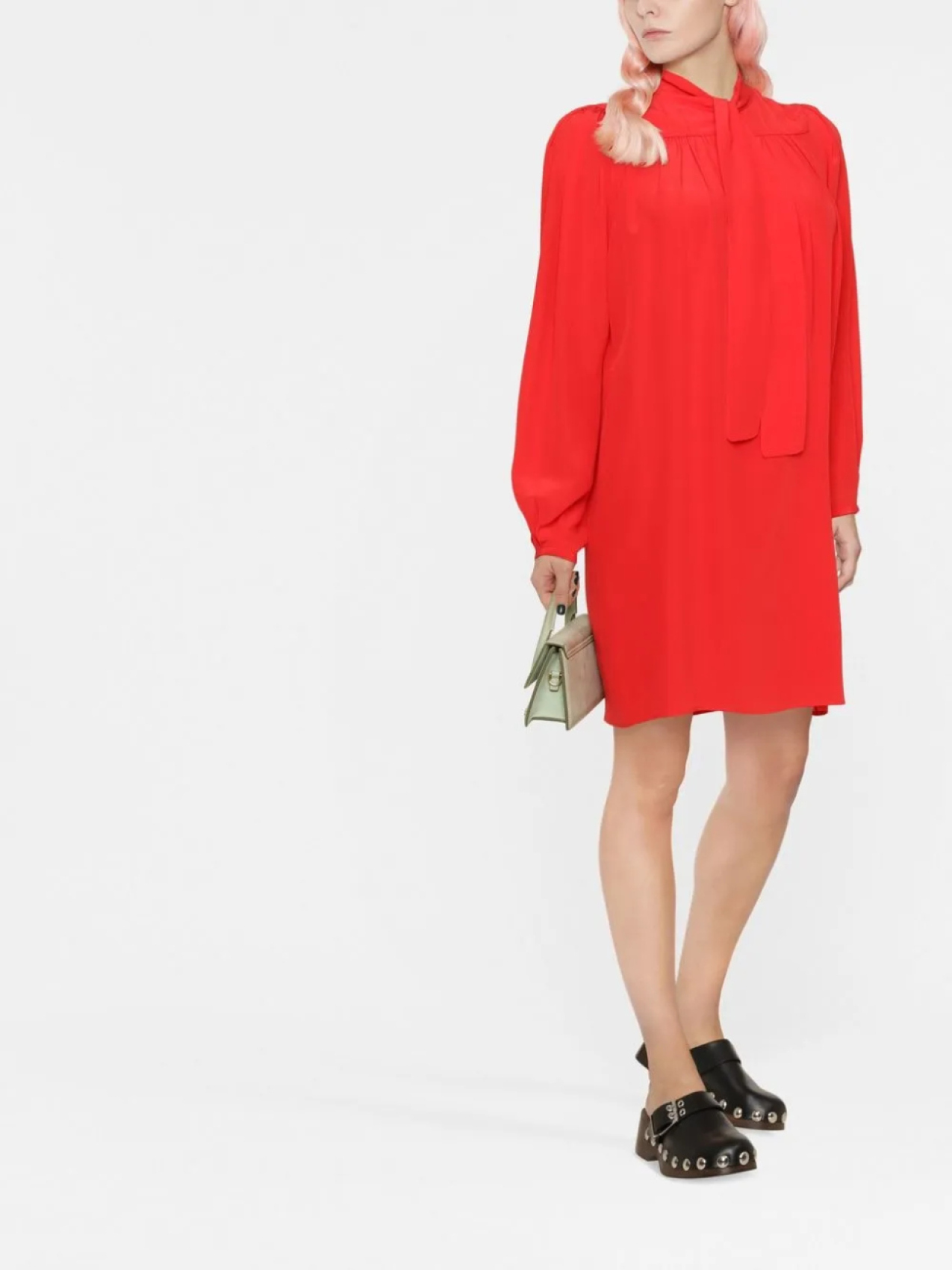Красный, шелк, воротничок с бантом, длинные рукава, кулиска на талии и прямой подол.