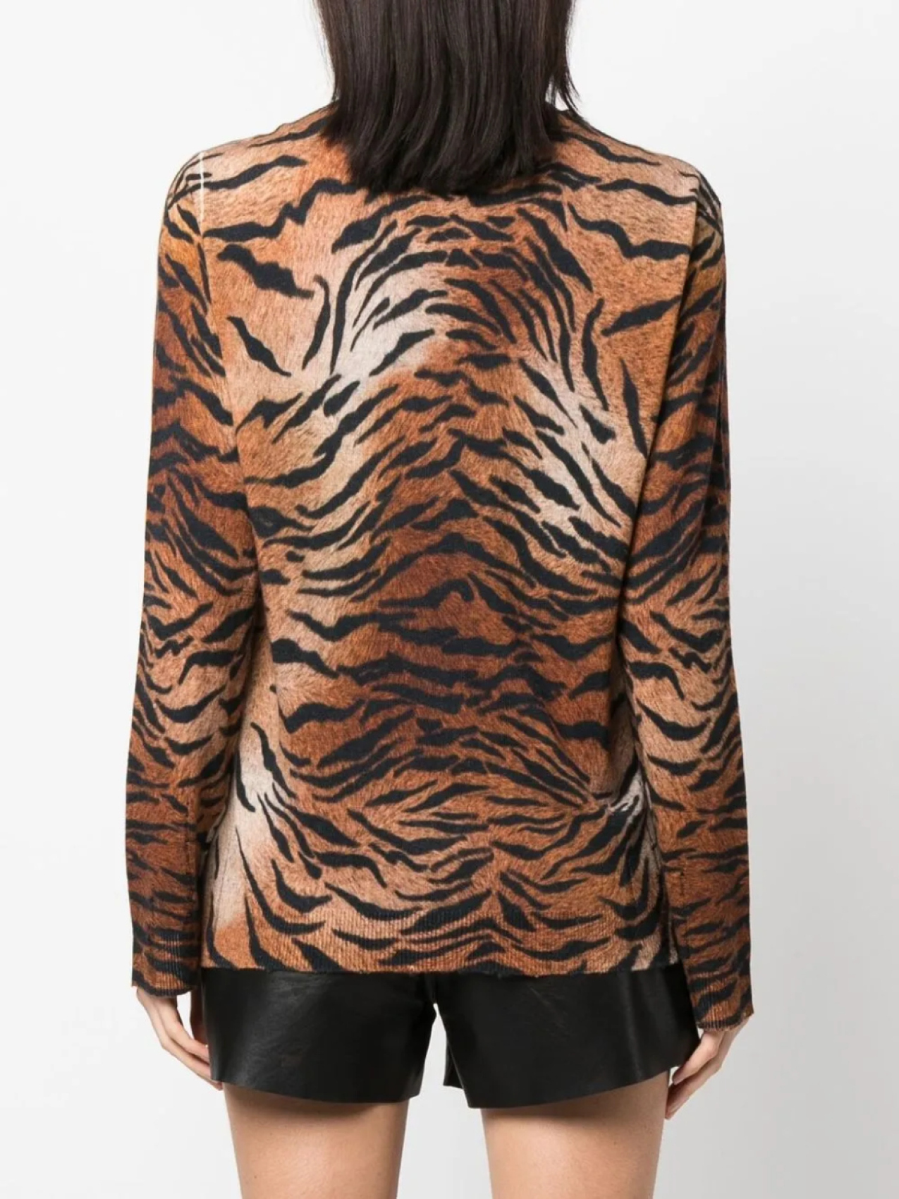 Необработанная шерсть, трикотажный материал, сплошной леопардовый принт, V-образный вырез, длинные рукава, манжеты в рубчик, отделка в рубчик и прямой подол.