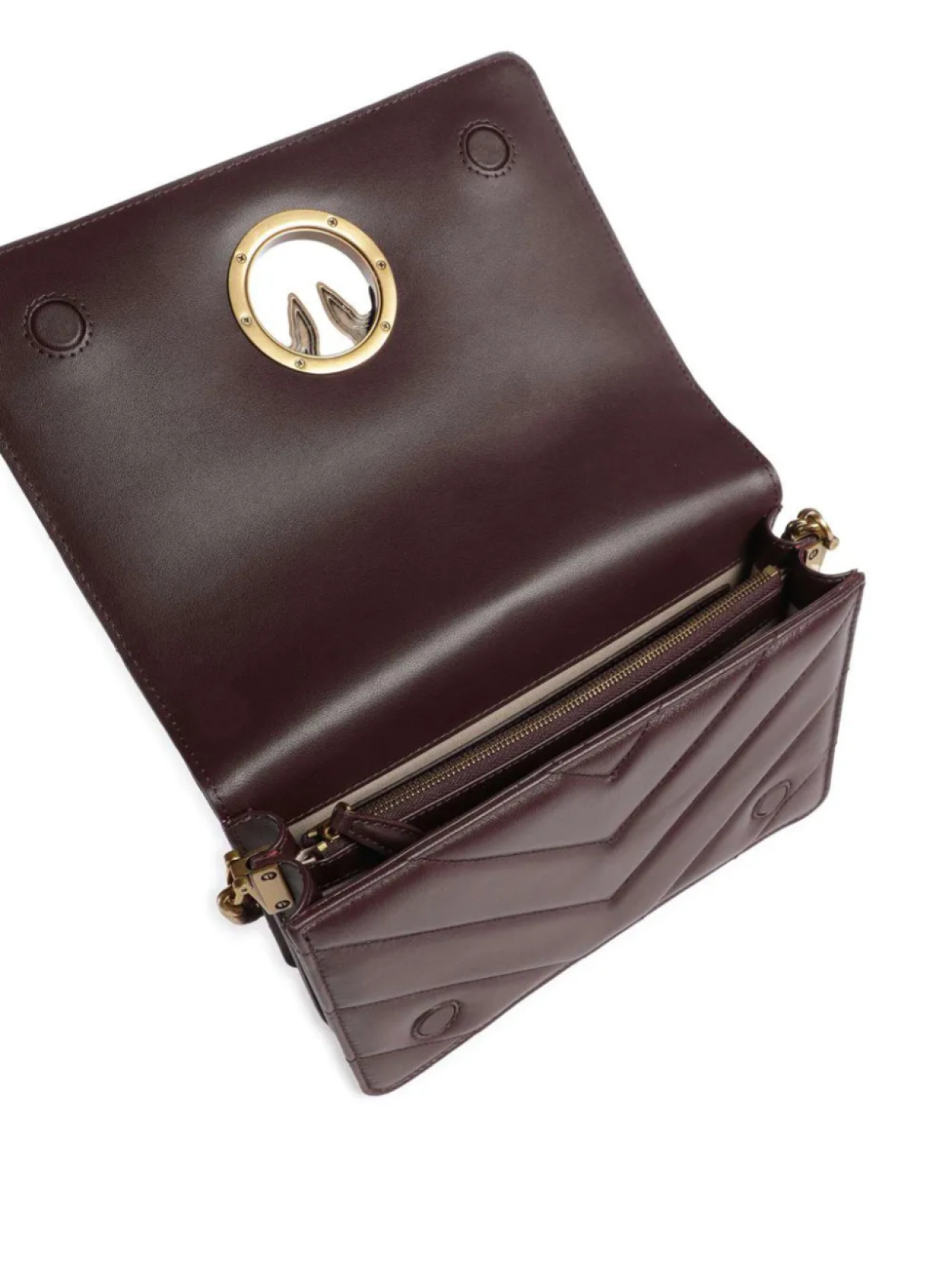 Коричневый откидной клапан с магнитной застежкой, фирменная пряжка с изображением птичек Love Birds, отделение с разделителями