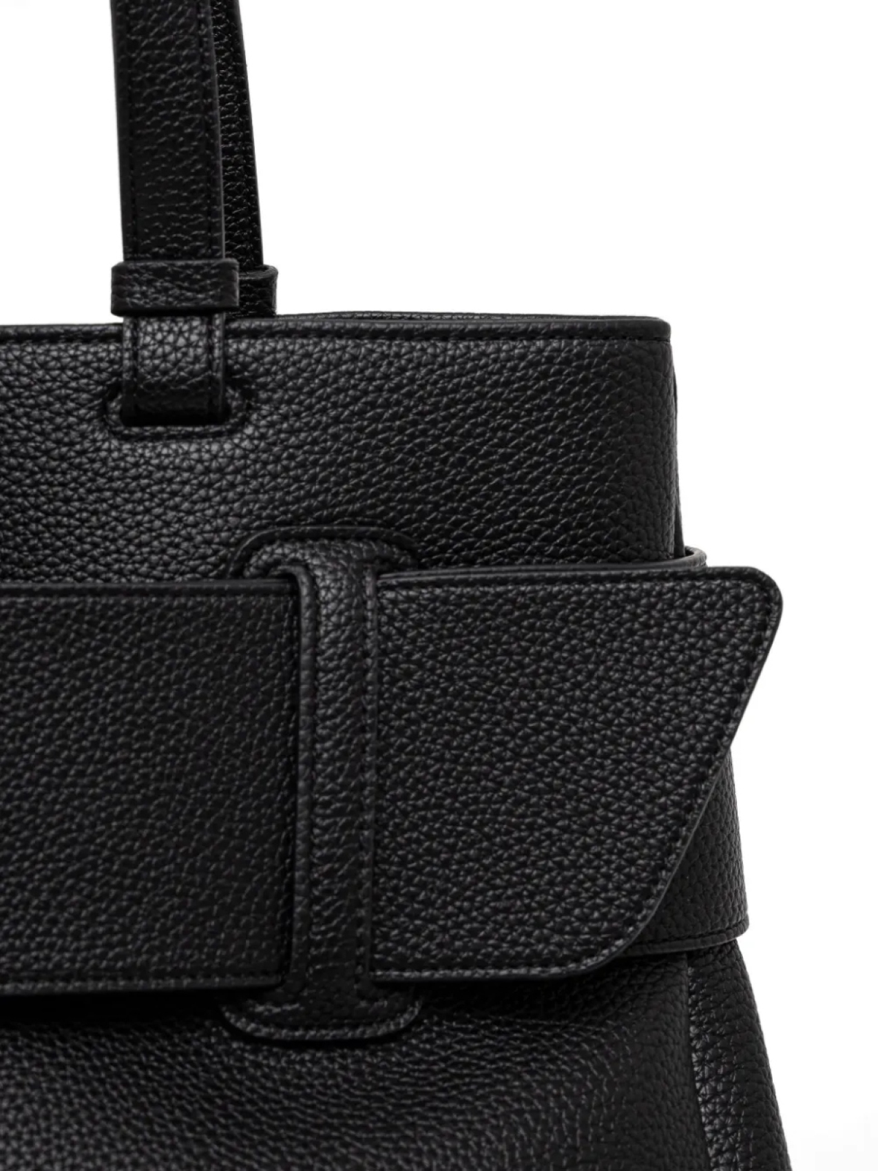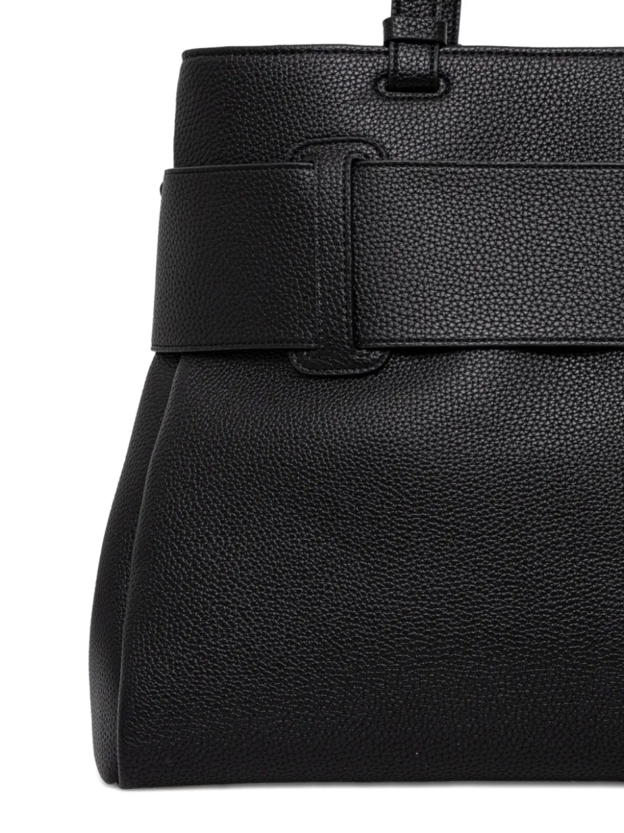 Черная зернистая отделка, скрытая магнитная застежка, декоративный ремень, две верхние ручки, табличка с логотипом, просторное внутреннее пространство