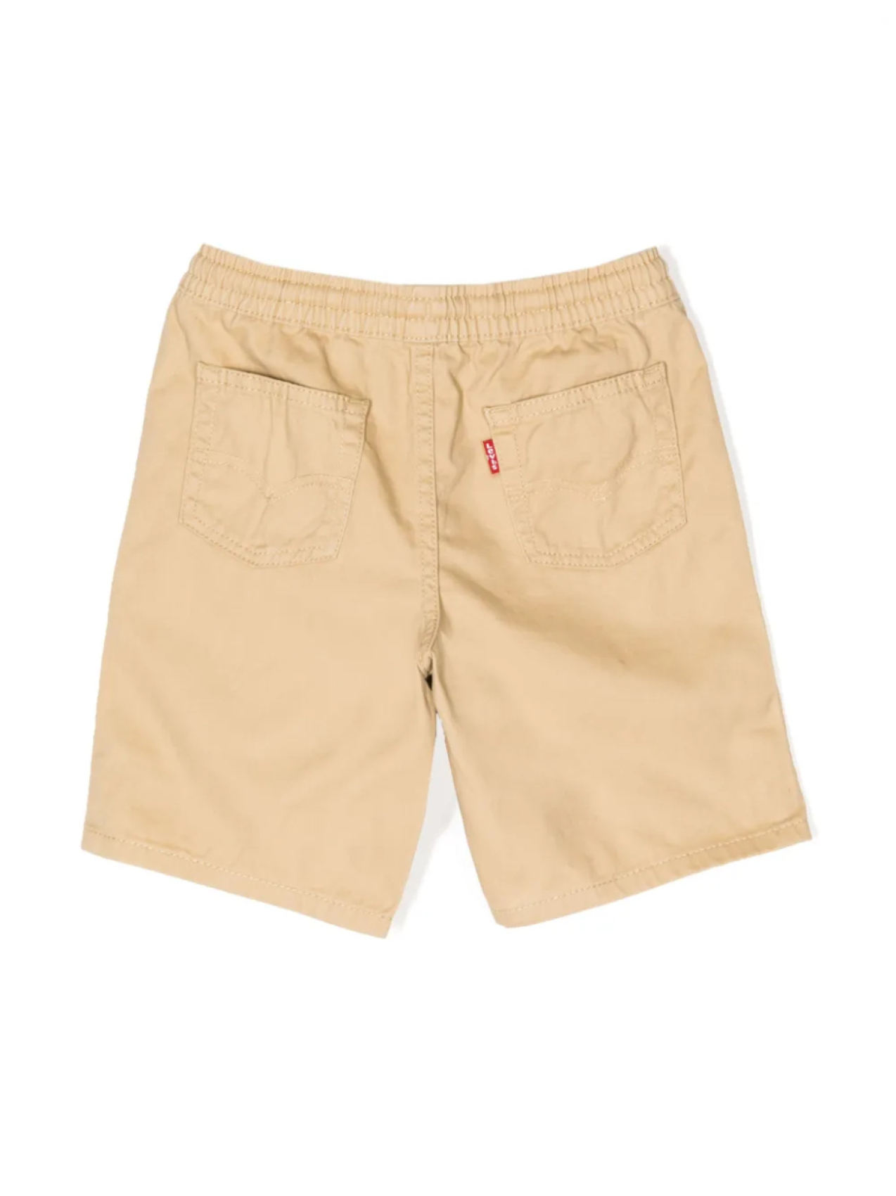 Бежевый, хлопок, эластичный пояс, кулиска, длина по колено, два прорезных кармана по бокам и два кармана с листочкой сзади.