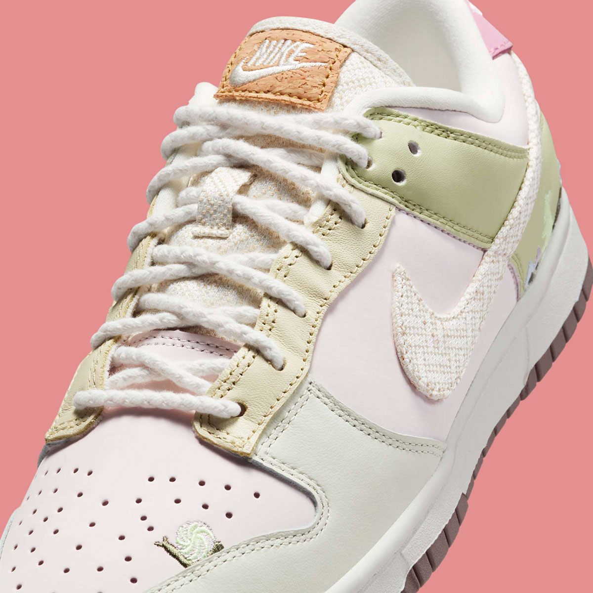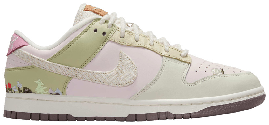 Nike Dunk Low «Mushroom» представлены в мягких пастельных тонах кремового, румяно-розового и светло-зеленого. Цветочные вышитые детали на носке и вокруг пятки добавляют очарования, делая дизайн ярким и индивидуальным. Текстурированный Swoosh и язычок с деревянным эффектом связывают природную тему воедино.