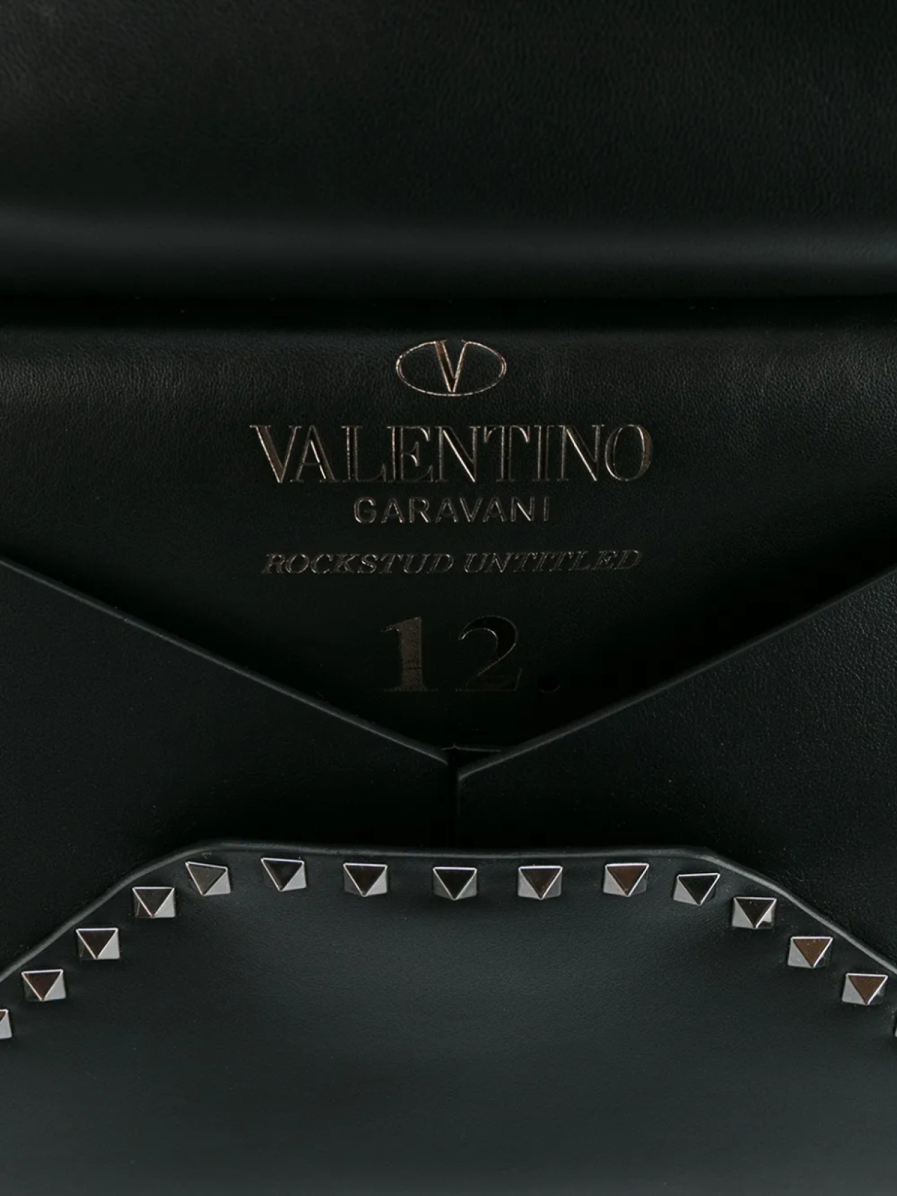 Черный кожаный клатч Rockstud Untitled от Valentino Garavani. Серебристая отделка Rockstud, застежка с клапаном спереди.