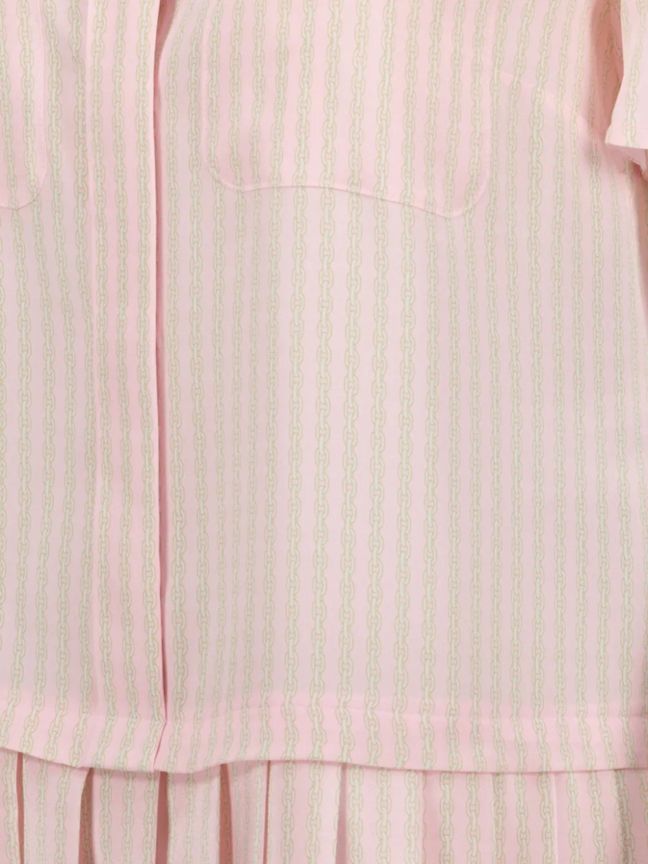 Светло-розовая застежка на пуговицы спереди, два накладных кармана на груди, плиссированная юбка, короткие рукава