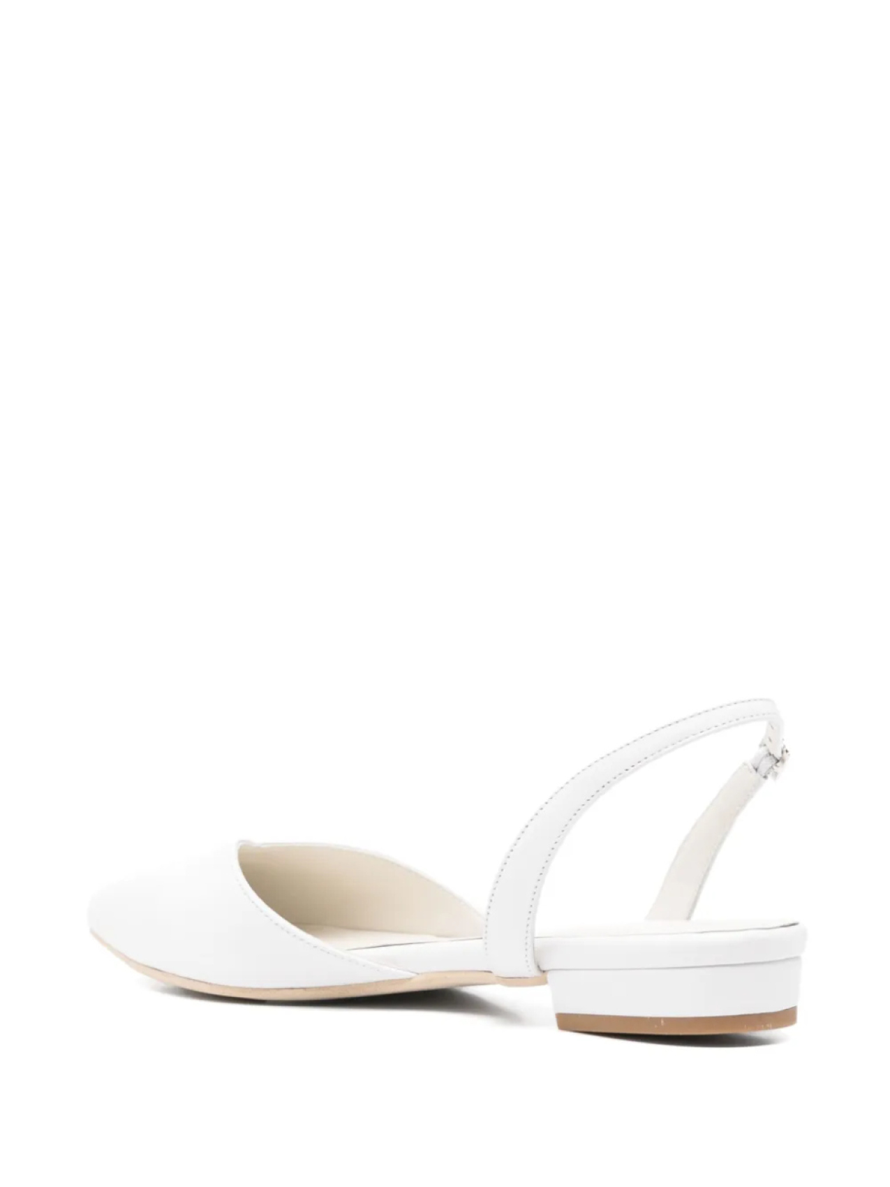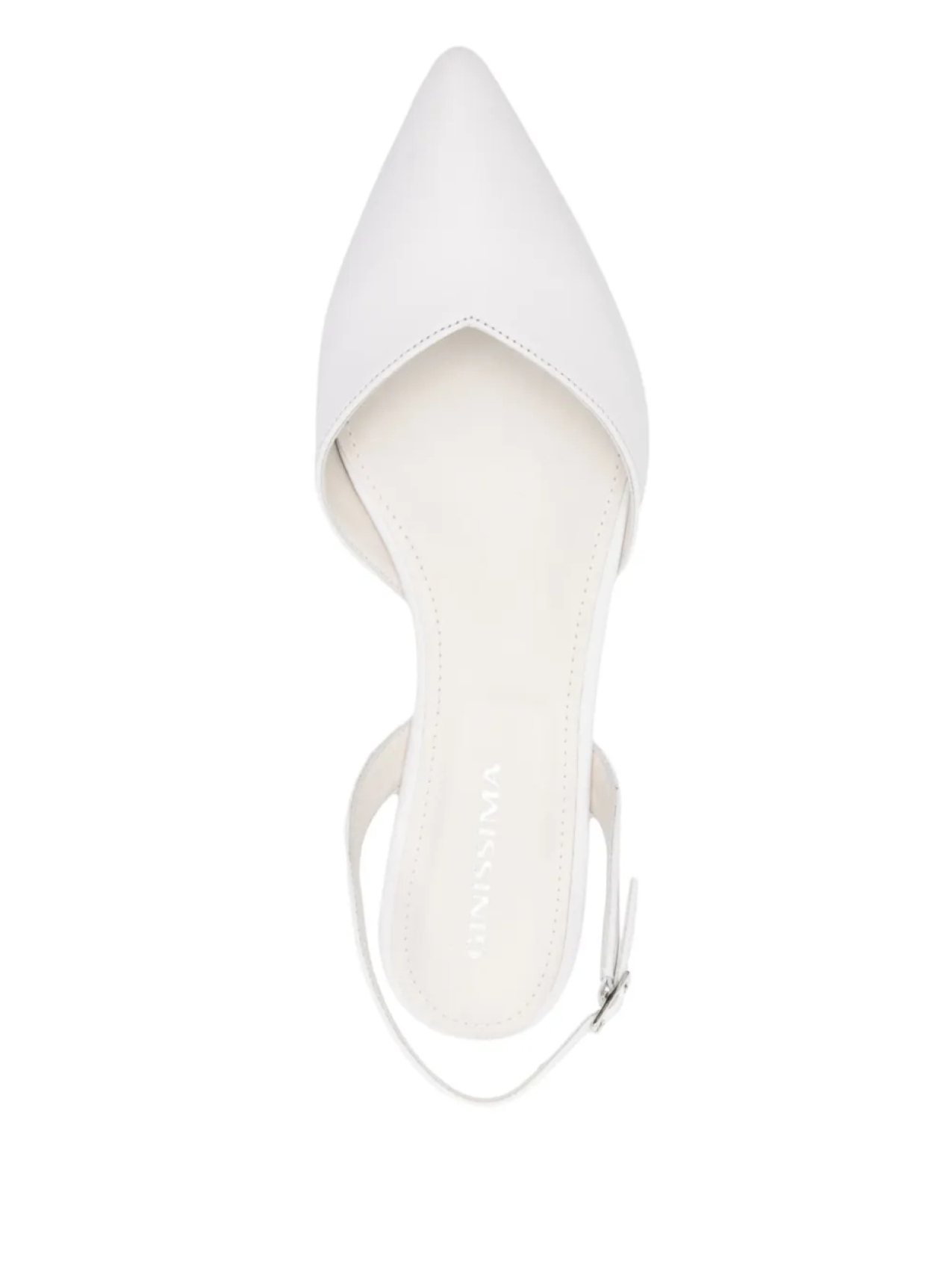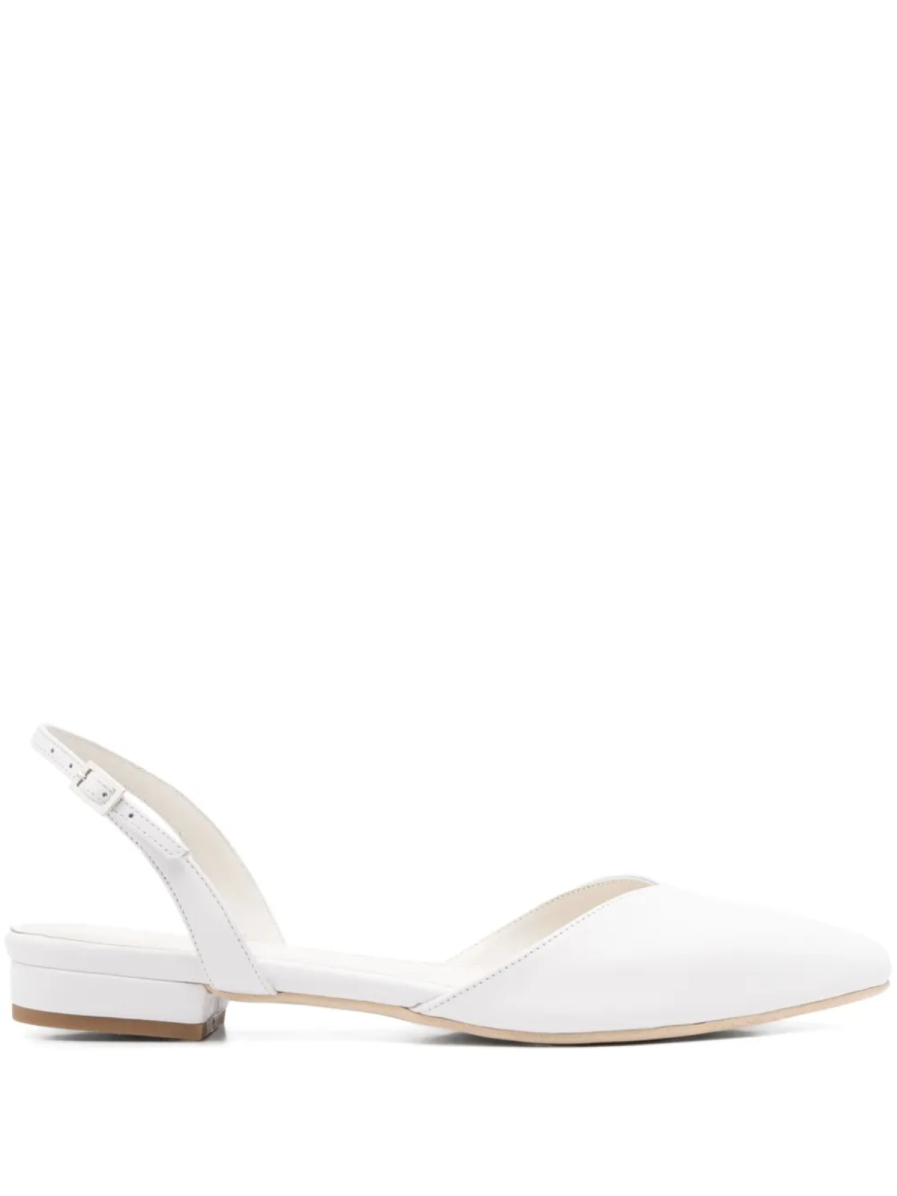 Белые туфли с застежкой-пряжкой, ремешок на пятке, фирменная стелька, острый носок, плоская подошва