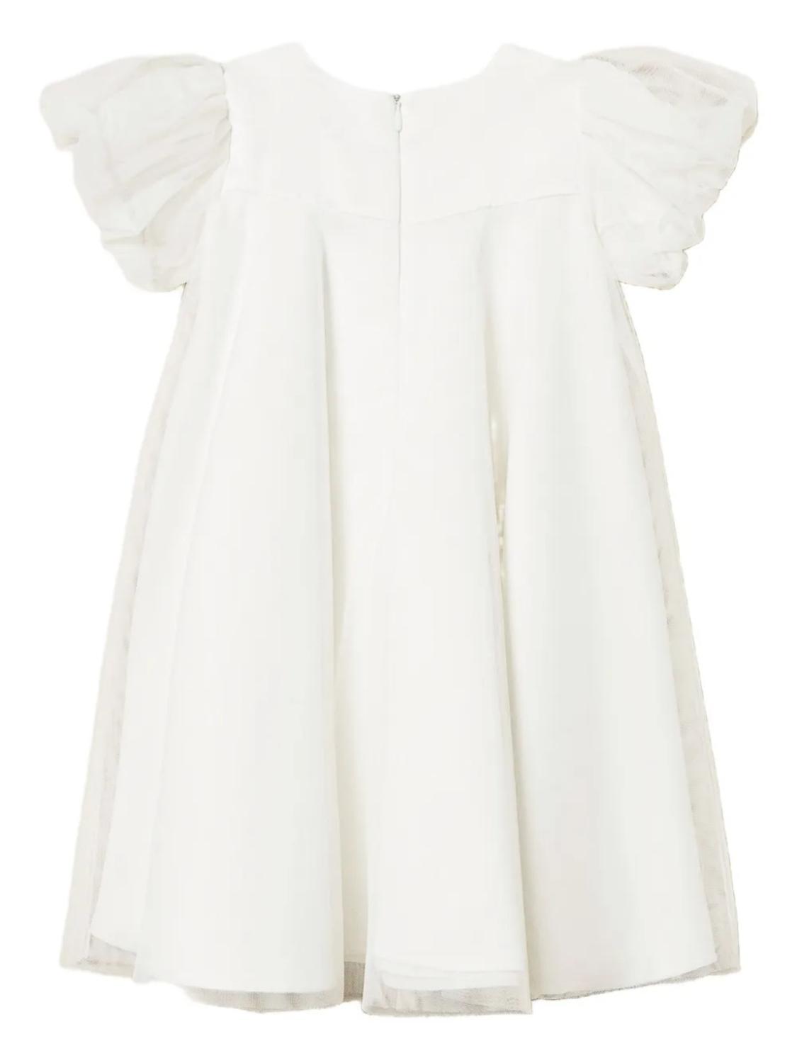 Белые рукава-фонарики, украшение в виде банта, круглый вырез, присборенная юбка, застежка-молния сзади