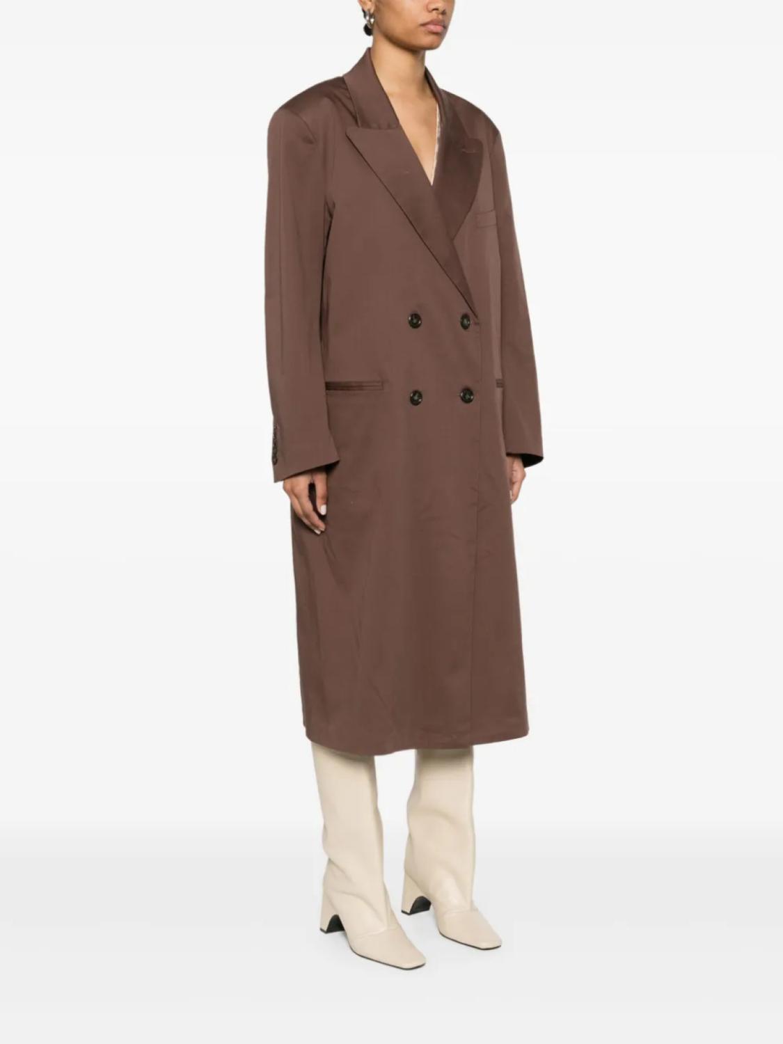 Шоколадно-коричневого цвета, двубортный, застегивается на пуговицы, нагрудный карман с листочкой, два прорезных кармана спереди, разрез сзади