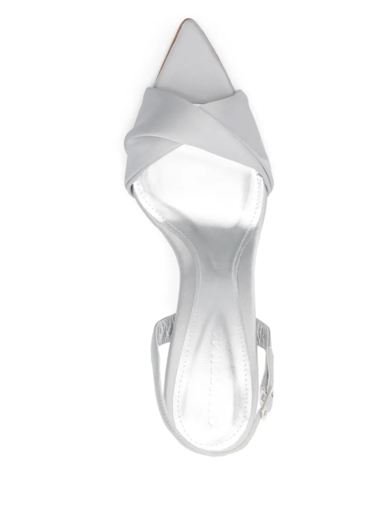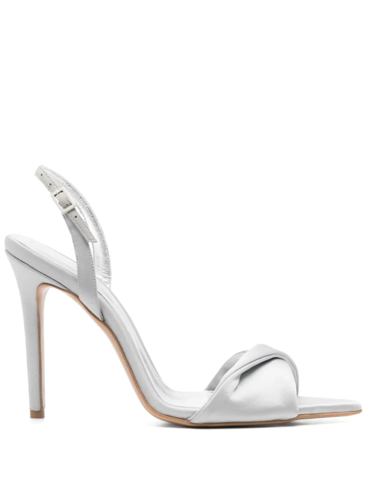 Серебристые туфли с застежкой-пряжкой, ремешком на пятке, высокой шпилькой и острым носком