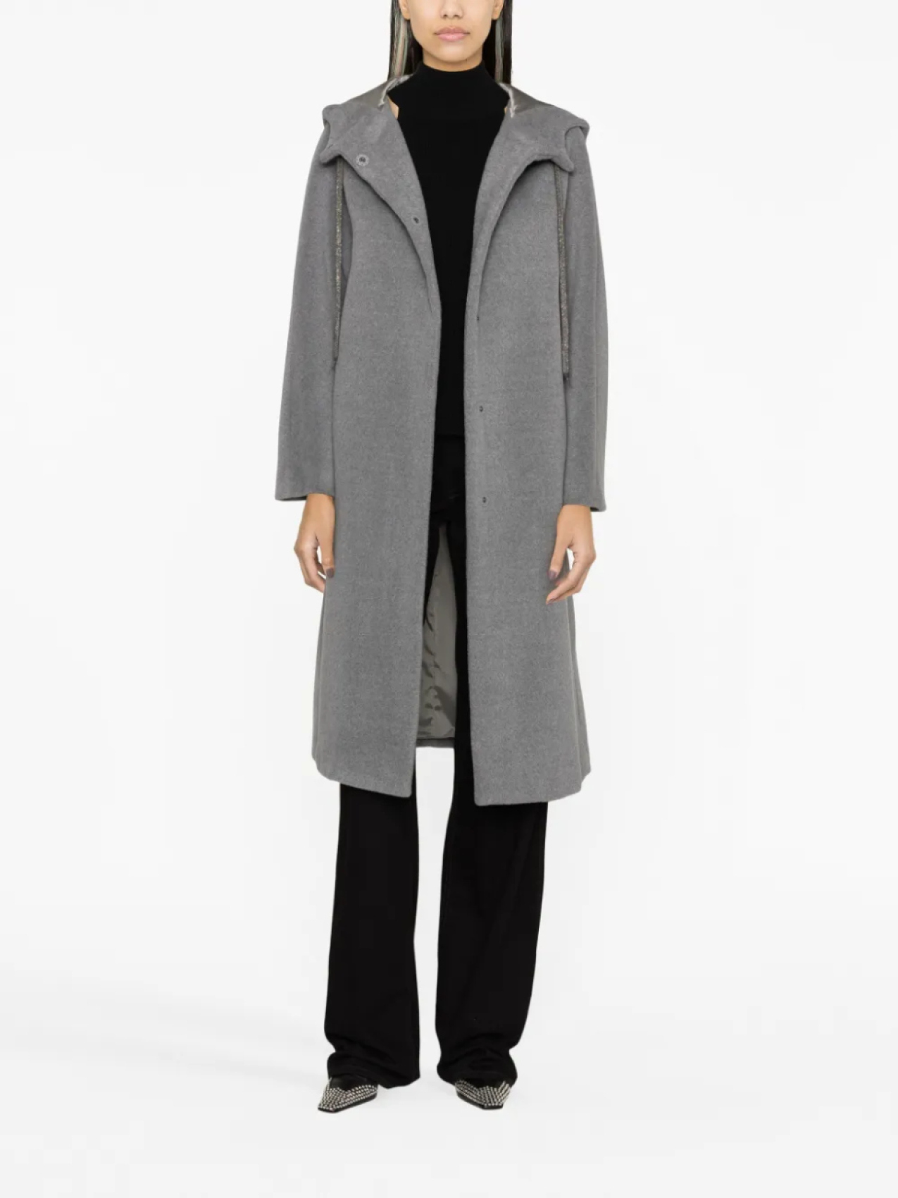 Серый, необработанная шерсть, затягивающийся на шнурок капюшон, высокий воротник, потайная застежка спереди, два прорезных кармана по бокам, ремень на талии, длинные рукава, прямой подол и длина ниже колена.