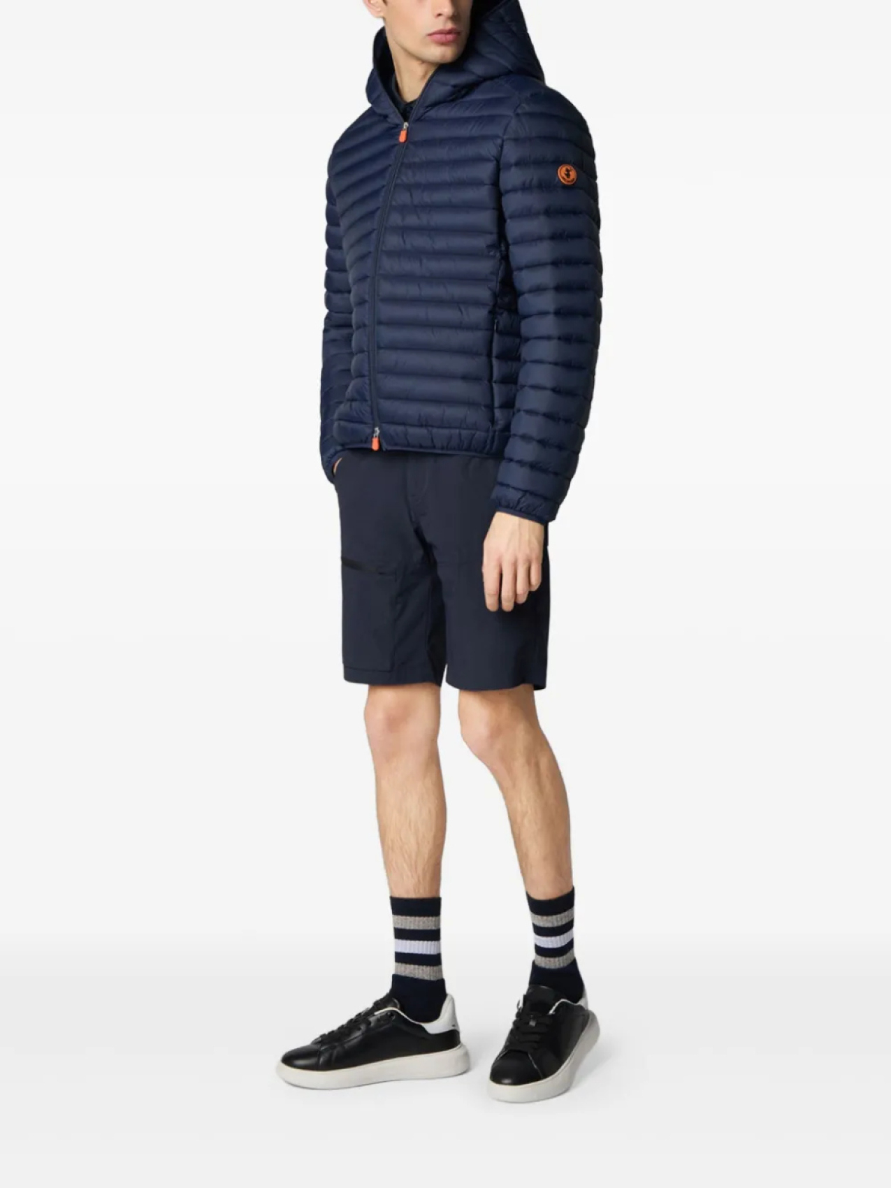 Темно-синяя застежка-молния спереди, два боковых кармана на молнии, классический капюшон, длинные рукава