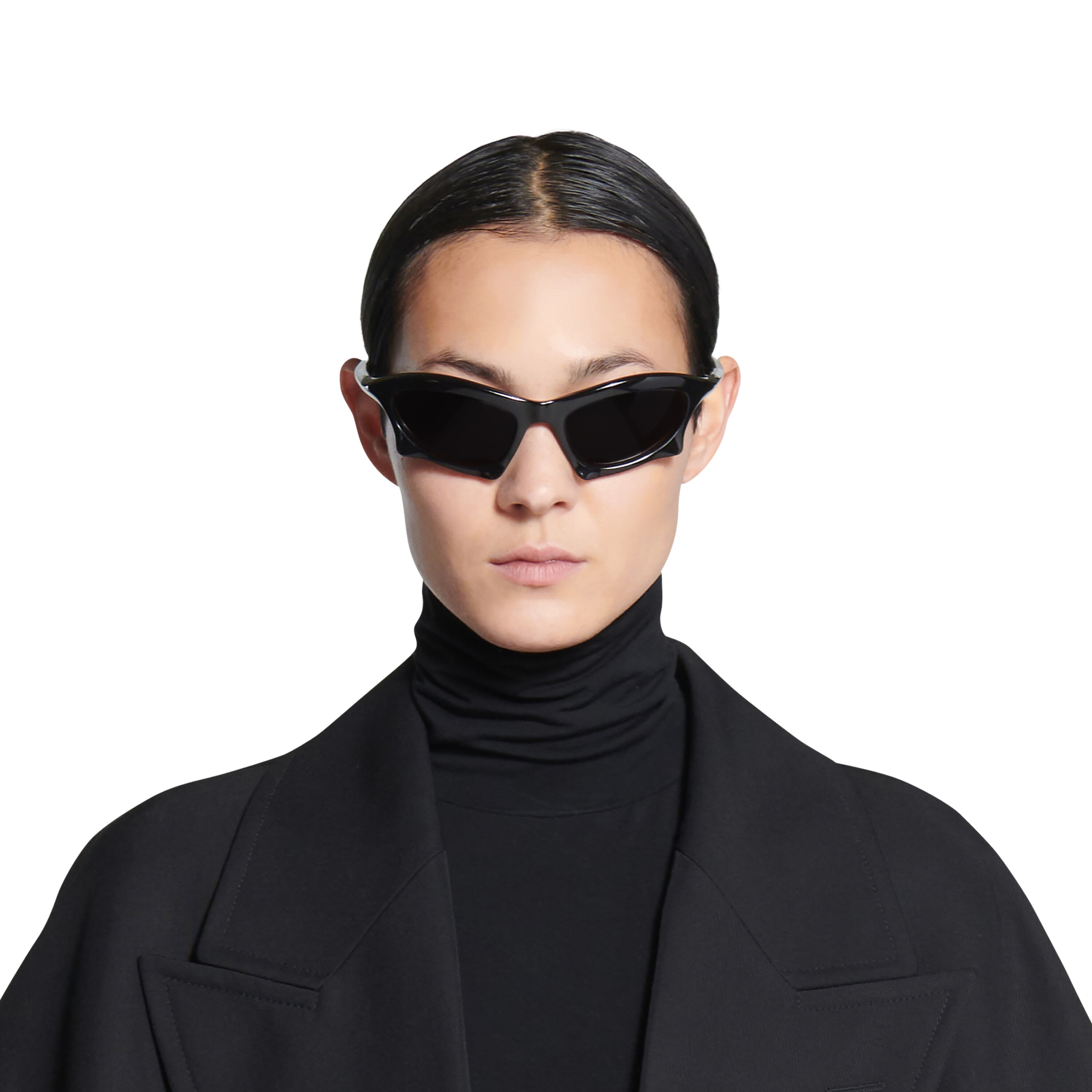 Солнцезащитные очки Bat Rectangle из черного био-нейлона с серыми линзами представлены в нескольких образах коллекции Balenciaga Summer 2022, Red Carpet.