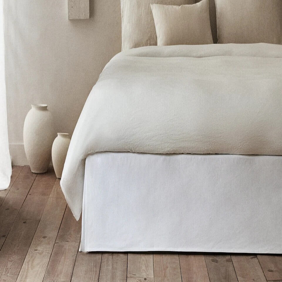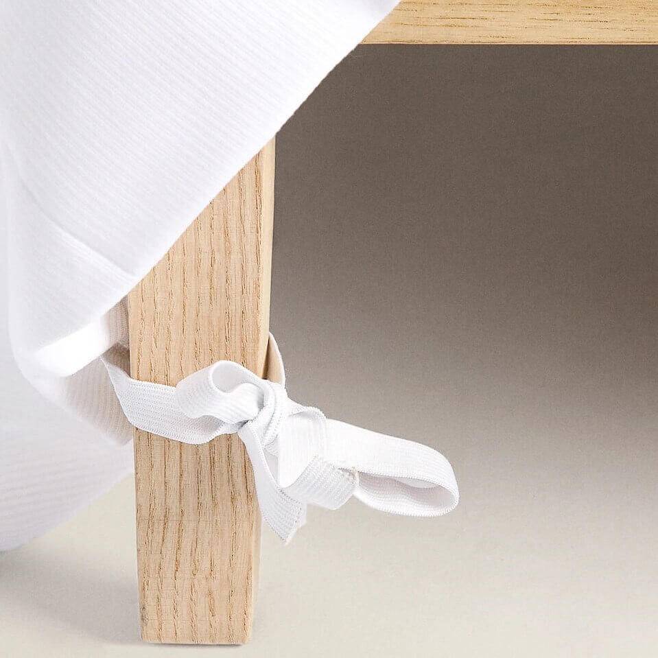 Подзор, также известный как покрывало для кровати, изготовлен из грубого хлопка. Он имеет два отверстия по углам и эластичные края, обеспечивающие аккуратное прилегание к матрасу. Длина основания валентной простыни составляет 200 см, а ширина варьируется в зависимости от размера кровати. Высота оборки 35 см. Подходит для кроватей с изголовьем, так как закрывает остальные 3 стороны кровати.