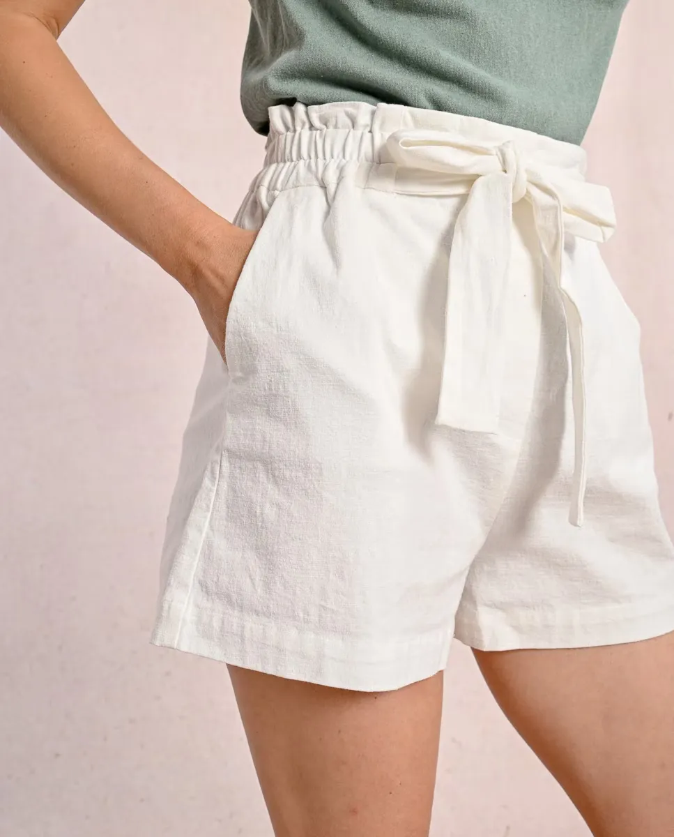 Шорты, завышенная талия и прямые штанины. Модель с завязкой на талии.