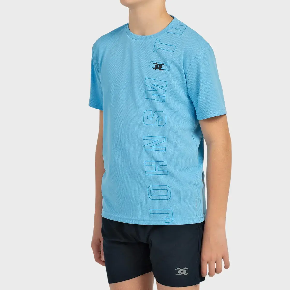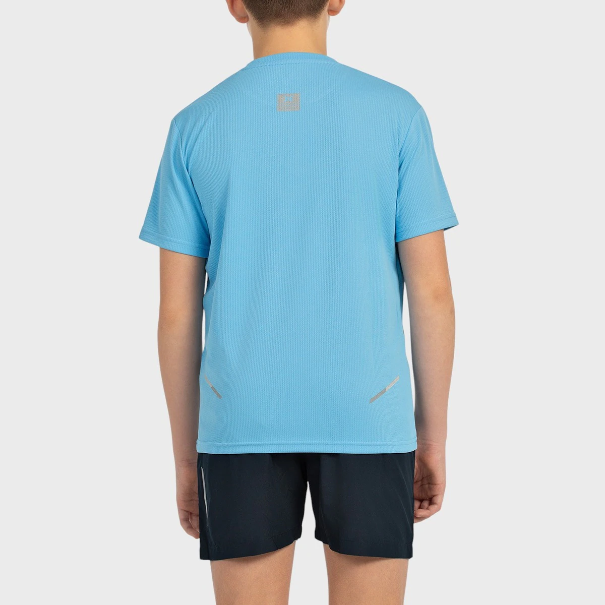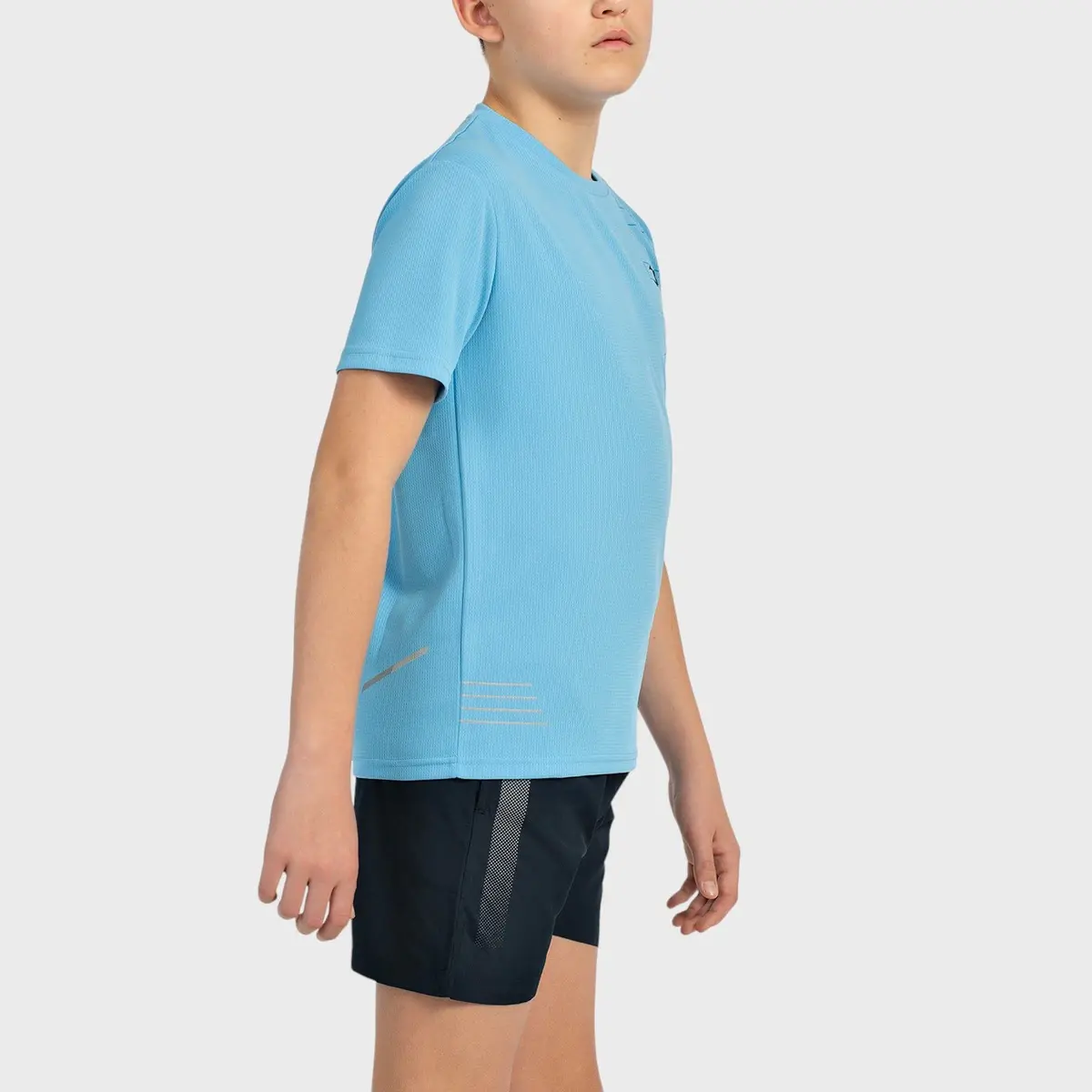 Беговой комплект мальчика. Футболка из полиэстера с быстросохнущей отделкой. Графика спереди и светоотражающие детали спереди и сзади. Брюки из легкой ткани из микрофибры с боковыми карманами и светоотражающими деталями.
