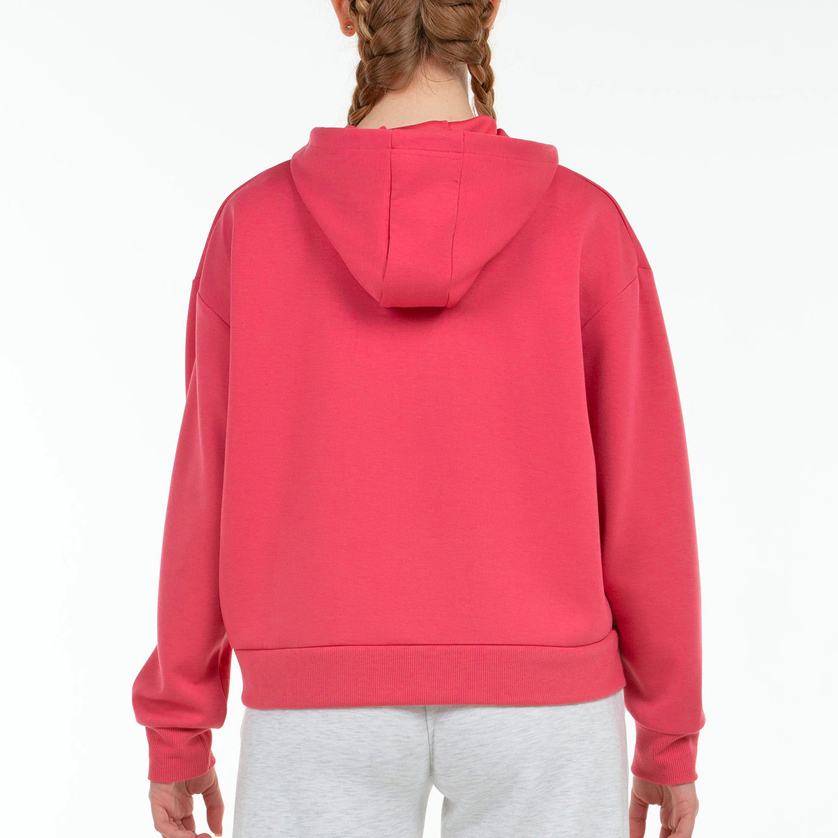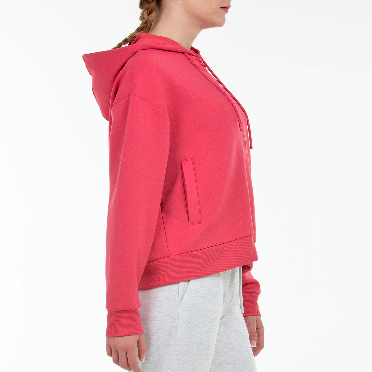 Очень удобная толстовка из стрейчевой полиэфирной ткани с вискозой. Струящаяся одежда с центральной молнией, капюшоном и карманами, рубчиком по низу и манжетам.